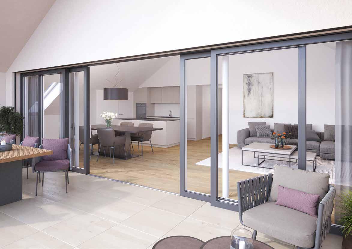 Kunststoff-Metallfenster mit 3-fach Isolierverglasung. Pro Raum mindestens ein Dreh-Kippflügel mit Einhandbedienung. Hebeschiebetüre in allen Wohnungen. Alle Fenster im Erdgeschoss mit Widerstandsklasse RC1, mit abschliessbaren Griffen ohne Verbundsicherheitsglas.