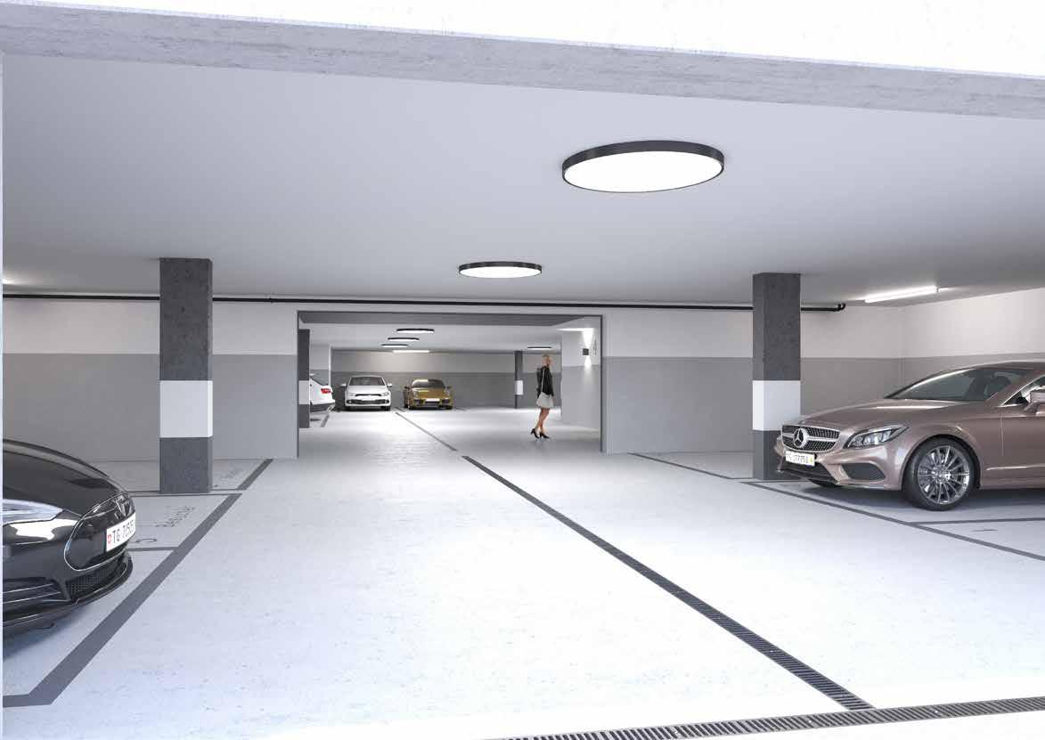 Tiefgarage mit 26 Parkplätzen, 6 gedeckte Parkplätze davon 3 Besucherparkplätze. Zusätzlich 1 Motorradplatz. Decken, Wände und Stützen gestrichen. Bodenbelag mit Hartbeton (roh). Automatisches Garagentor, Funksender und Schlüsselschalter (Pro Parkplatz einen Handsender). Flachband für E-Mobility Anschluss vorbereitet.