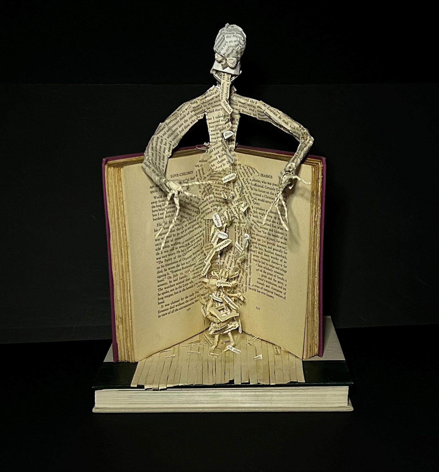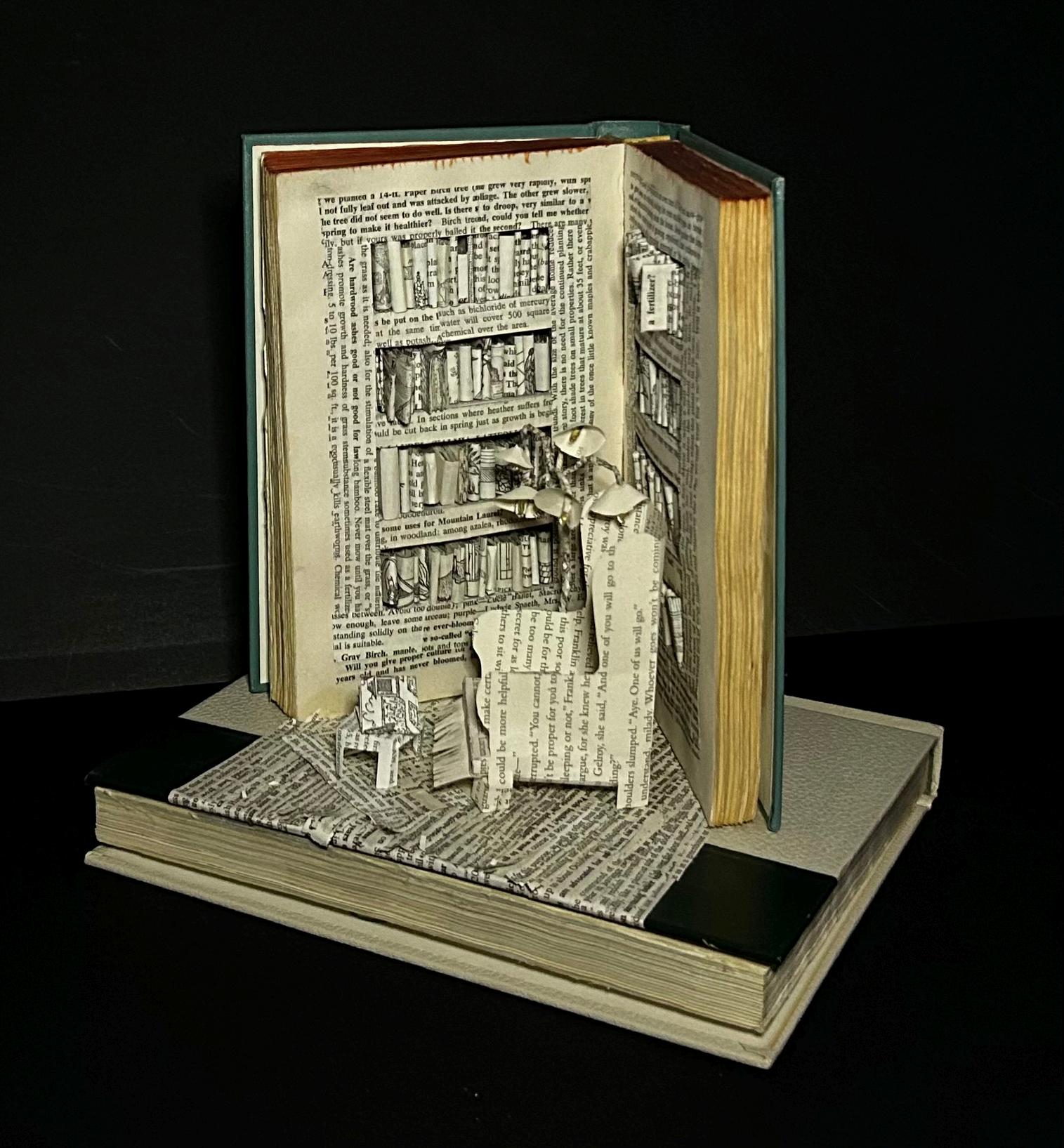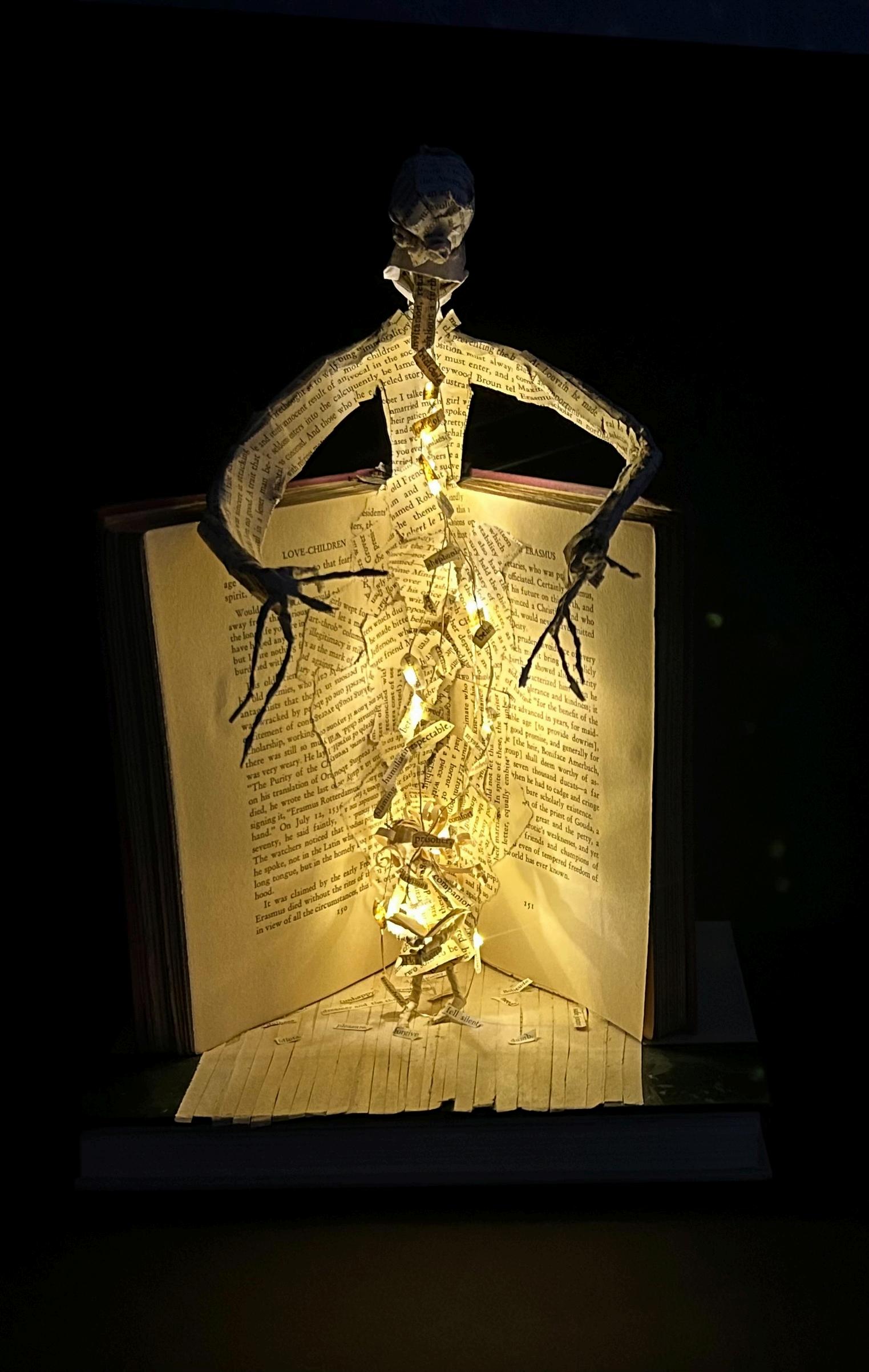 Materials: encyclopedia base, and an old gardening book, book pages, white glue, LED lights, unlit