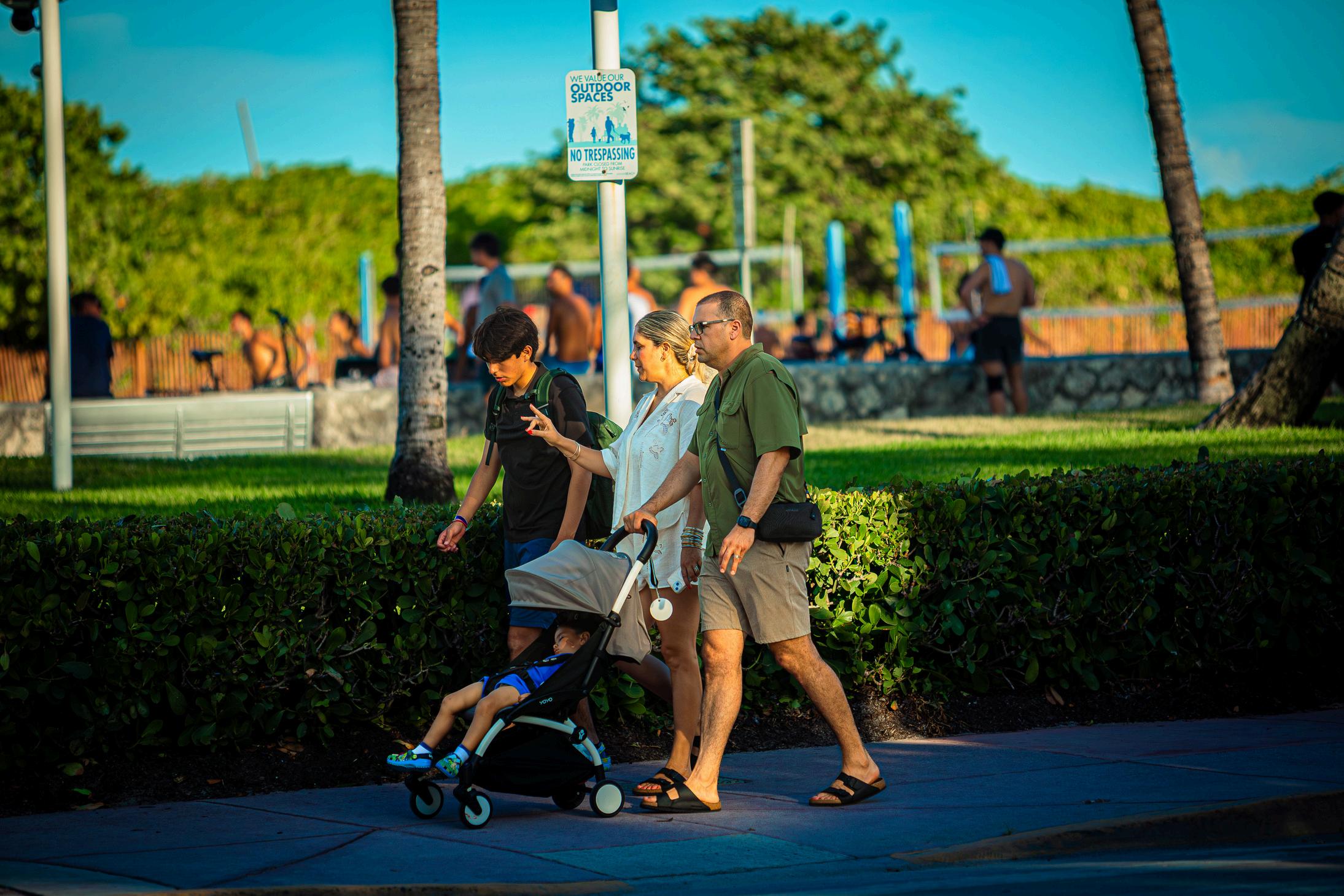 A family is on the sidewalk of Ocean Drive. The son wears a baby carrier. The father gently pushes a stroller where the son is sleeping. Despite the sleeping child, the parents and their oldest son are leaned in close, sharing a soft conversation, their own little world