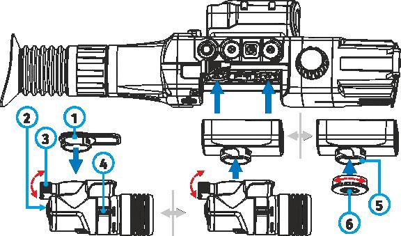2. If the device does not have an IR illuminator, turn the plug (6) according to the image and pull it in the opposite direction from the device/ batter (Digisight Ultra LRF digital riflescopes).