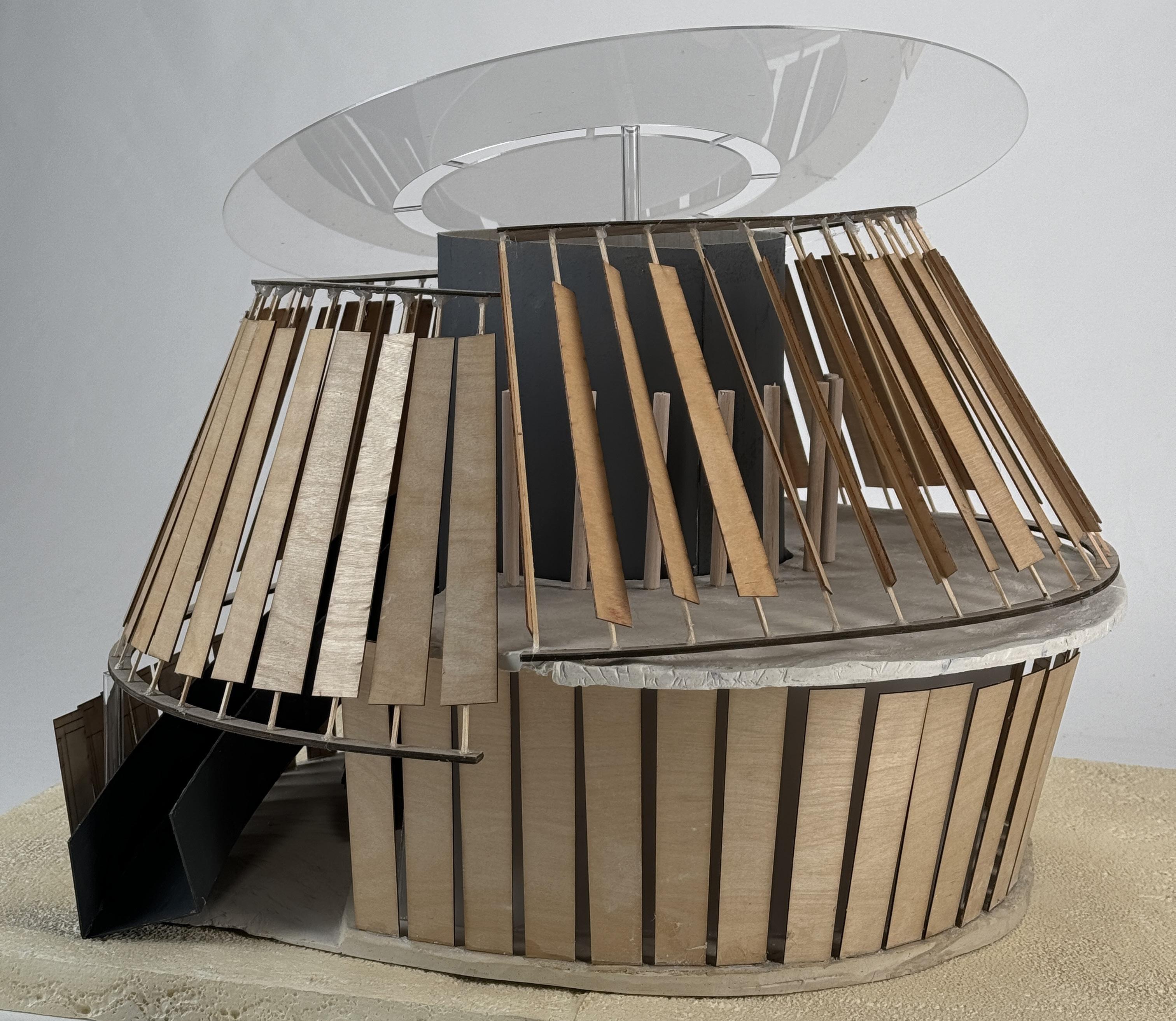 A tranquil coastal dwelling inspired by seashell geometries. The design features dynamic panels that respond to wind, creating a shifting interior experience with changing light and wind conditions. The top floor is an open space with large panels rotating with the wind, while the bottom floor offers a more private, controlled experience with smaller panels manipulated manually.