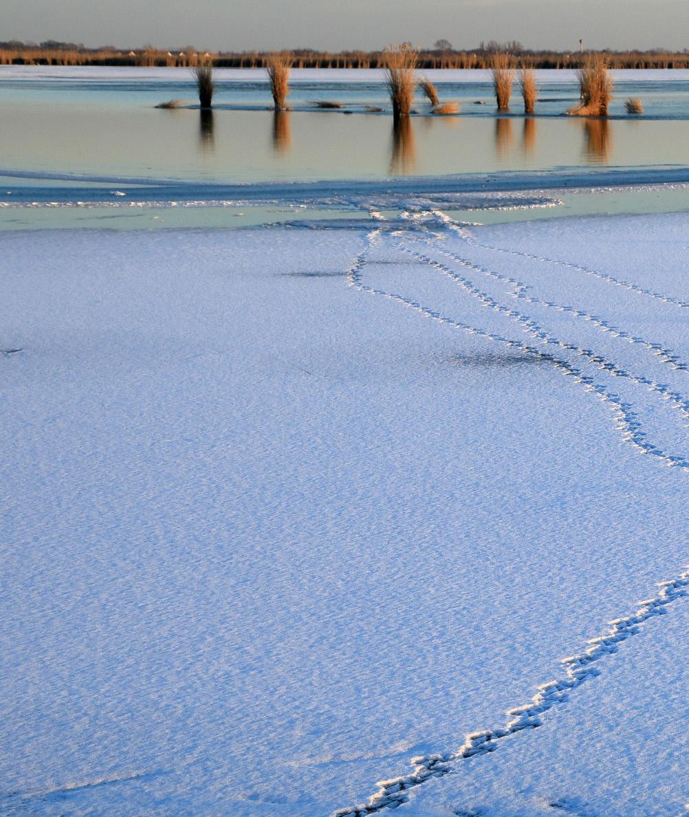 Amikor szóba került, hogy vannak-e újabb téli képeink, első gondolatom az volt: nem is volt tél! Aztán amikor a képeimet kezdtem nézegetni, kiderült, hogy azért egy pár nap hideg mégis csak volt. A néhány nap folyamatos fagy befagyasztotta a közeli tó felszínét és a sekély vizű csatornákat, a fűtetlen helyiségek ablakára jégvirágot növesztett. Érdemes keresni fagyos időben a sekély állóvizeket, a felszálló és jégbefagyó buborékok, különös jégbefagyott formák izgalmas makrofotós témát jelentenek. Az elmúlt télen, a pár napig tartó erősebb fagy után viharos szél érkezett. A tó pár centis jegét feltörte és kihordta a partra.