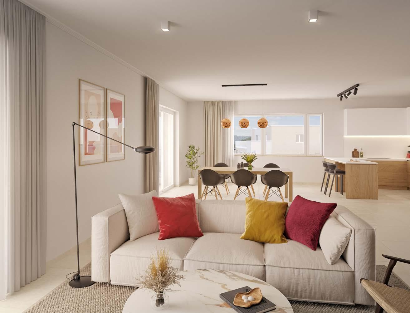 The interiors feature large-format 80×80 cm tiles, bringing brightness and uniformity to the spaces. Included paints and wall coverings ensure walls that are ready to live in, providing daily comfort and practicality.