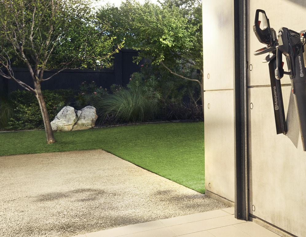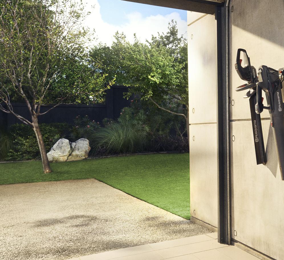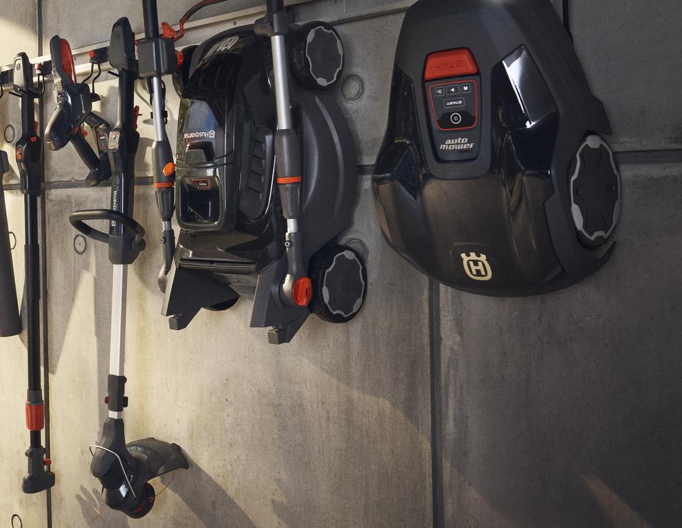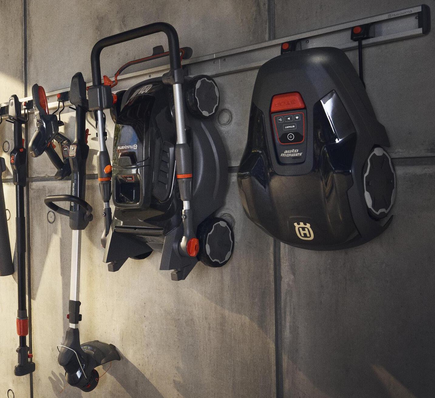 With Husqvarna Aspire™ you’ll have your garden machines stored in perfect order. The products are designed to take up as little space as possible when not in use, being foldable, adjustable or with removable parts. Each product has a bespoke metal hook, ready to mount directly on the wall for easy and stable storage. The optional storage rail provides an even neater and more flexible solution.