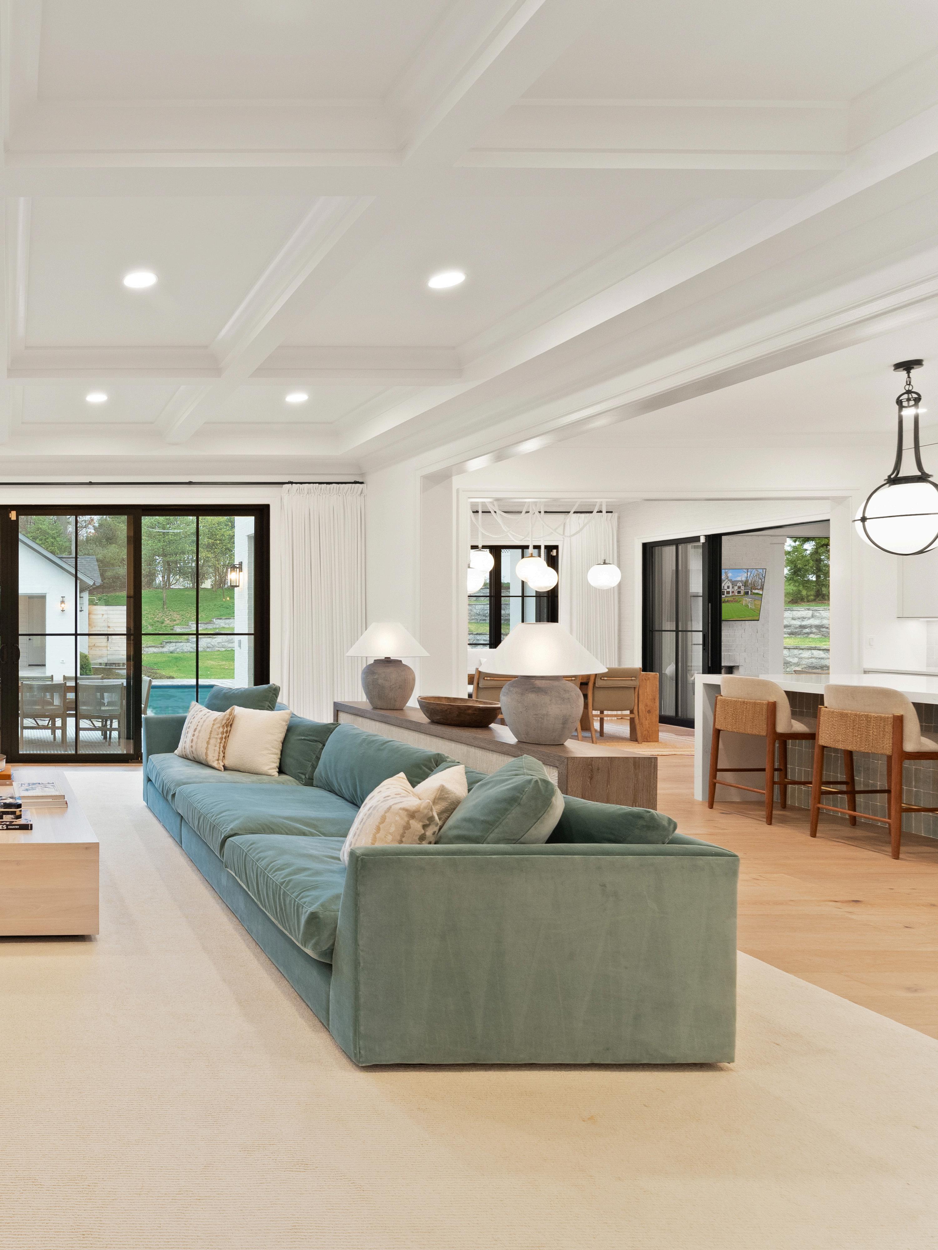 A true extension of the home's luxurious lifestyle, the pool house and covered entertaining pavilion redefine outdoor hospitality. Thoughtfully appointed with a powder room, outdoor shower, and an entertaining pantry with beverage refri gerator, every detail has been considered for effortless warm-weather entertaining. At the center of it all, a lounge area anchored by a built-in linear gas fire pit creates an inviting atmosphere that transitions seamlessly from sun-soaked afternoons to starlit evenings.