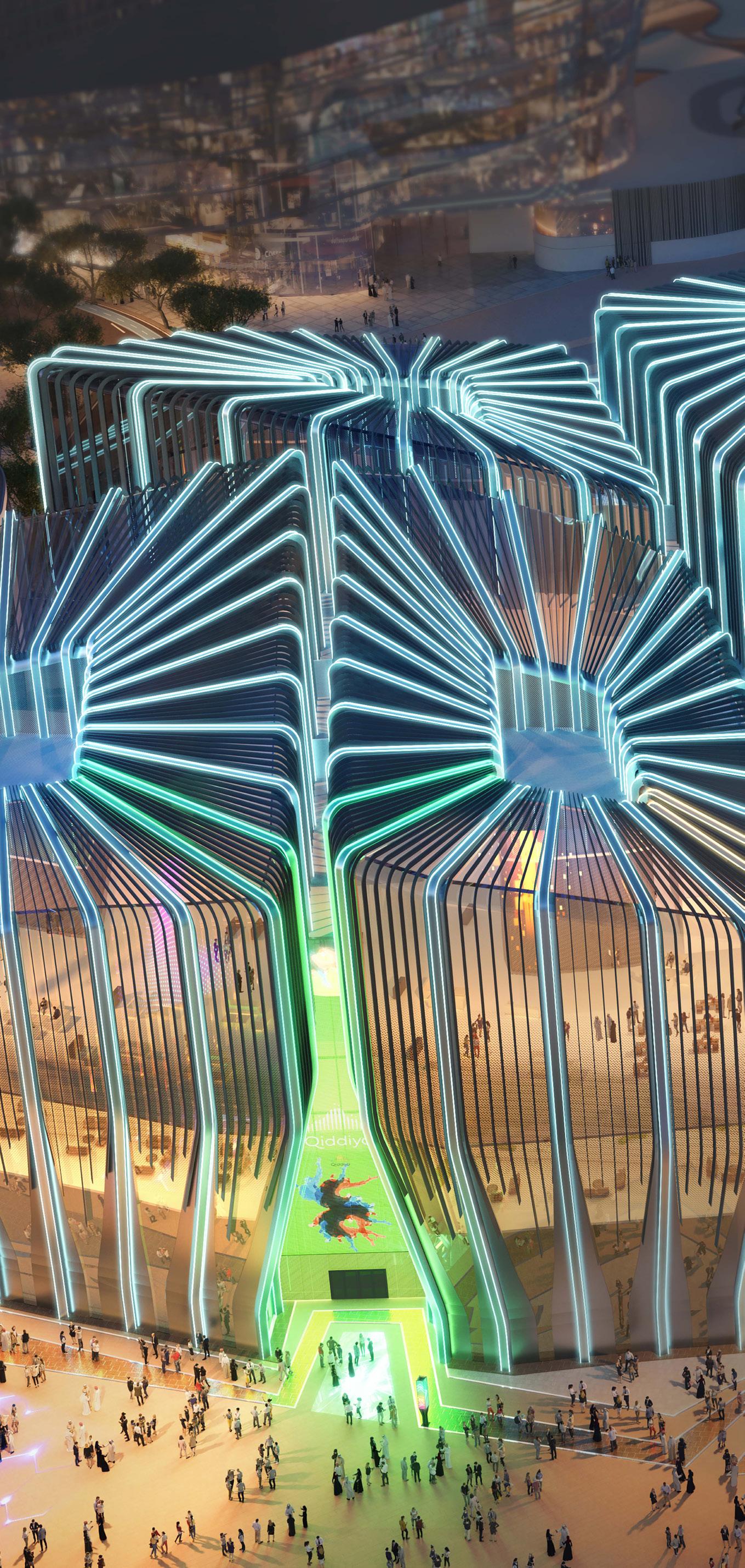 The stadium’s form and façade were inspired by the traditional “gahfiya,” a knitted skull cap worn throughout the region.
