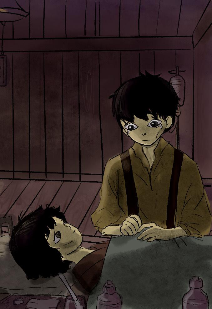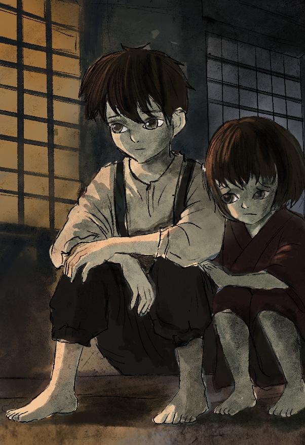 Seita stepped into the dimly lit room where his mother lay. A thin sheet covered most of her body, but the burns stretched beyond its reach. Her breath was shallow, her lips cracked, yet she smiled when she saw them.