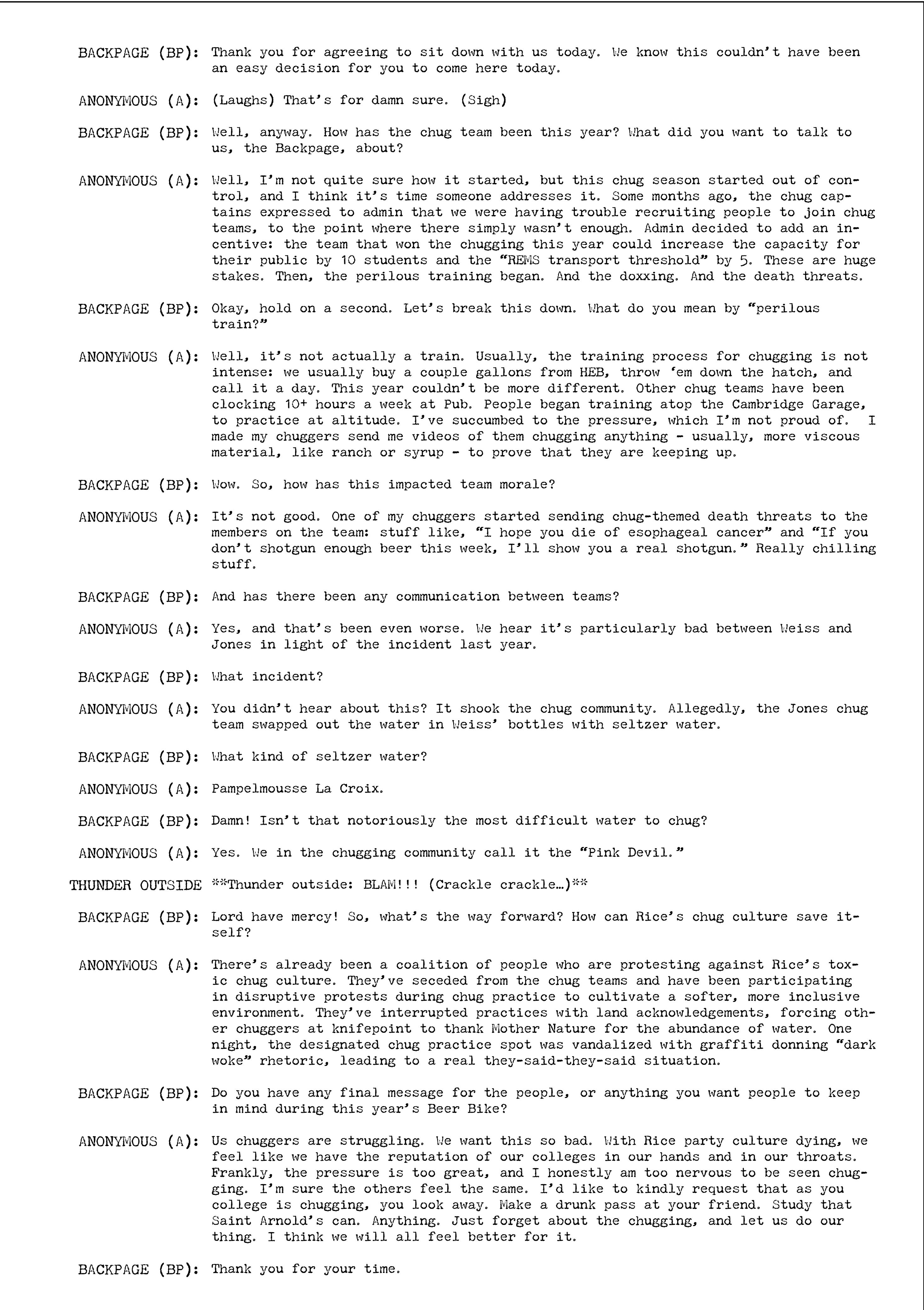 Recently, the Backpage sat down with a current Beer Bike chugger who chose to remain anonymous. He spoke to us from the other side of a confessional we were all cramped in, and he used a voice changer during the interview.