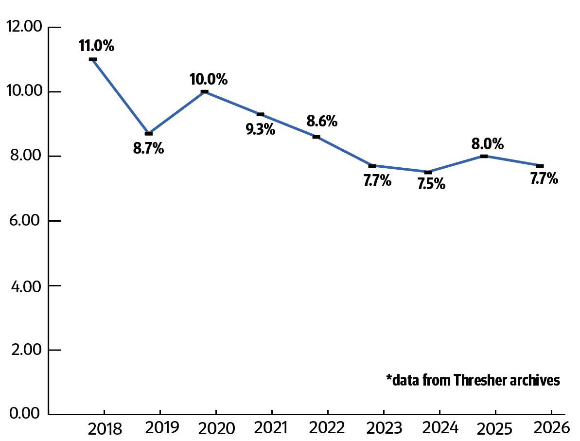 This marks a slight decrease from the previous year, which saw a 8.0% acceptance rate of 2,948 applicants out of 36,791. From 2020 to 2024, the acceptance rate steadily decreased from 10% to 7.5% before rising slightly in 2025.