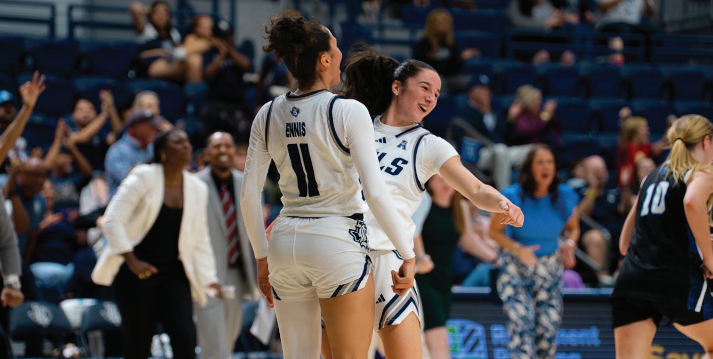 Senior guard Dominique Ennis celebrates with junior guard Louann Battiston during a Rice women’s basketball game against Middle Tennessee State University on Nov. 15.