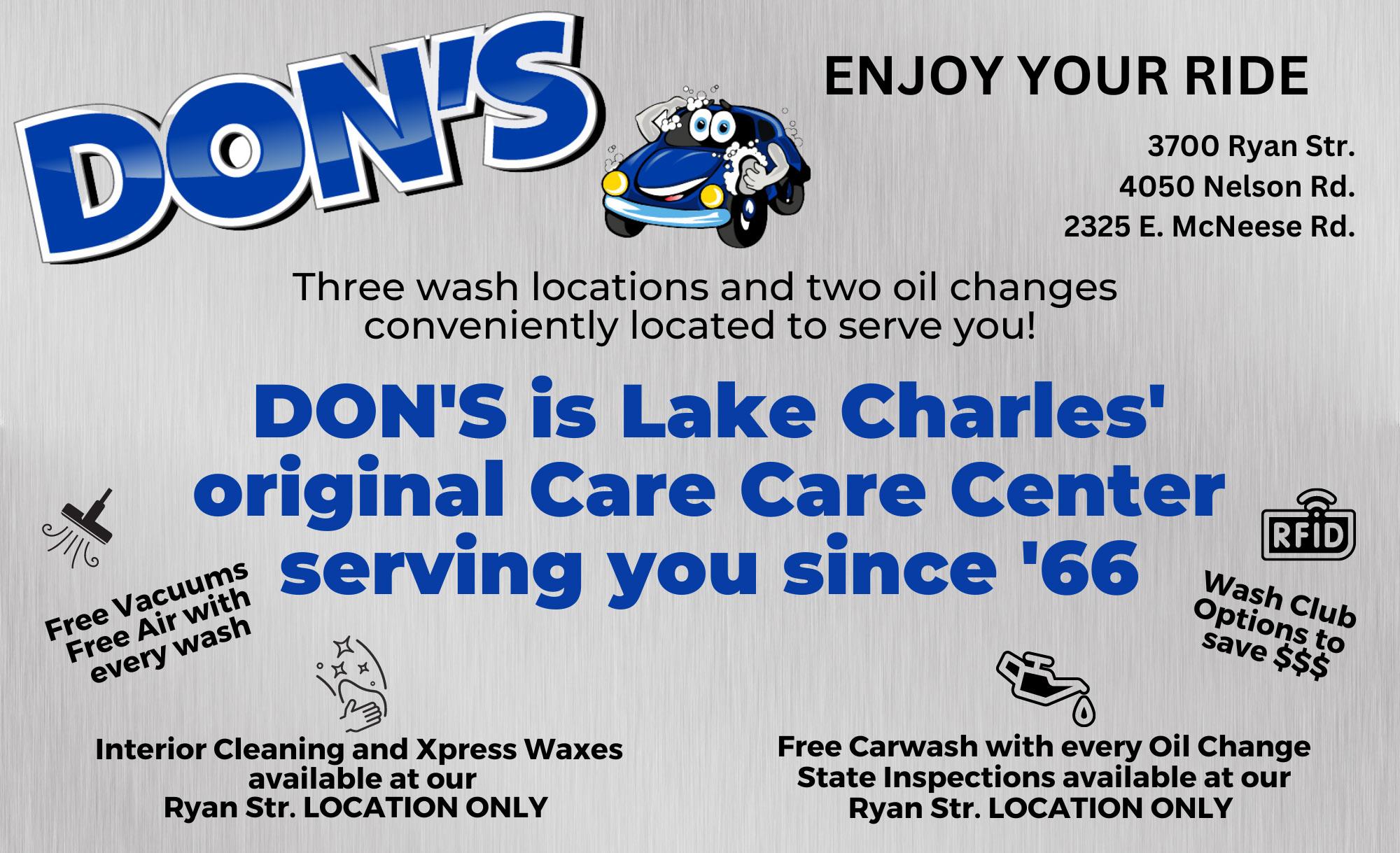 Let’s set the scene. It’s 1966 and Don Bruno is working for a company called Wizard Enterprises, which owned and operated service stations and offered free carwashes for customers who fueled up. Several years later, Don would leave the company with his share in hand – a carwash located in the Albertson’s parking lot. Fast forward once more and Don’s relocated to its flagship carwash which is still operational today, Don’s Carwash & Quick Lube located at 3700 Ryan Street in Lake Charles. Over four decades later this family-owned business, three generations deep, boasts five businesses; three full-service locations, two with oil change, and two self-serve washes throughout the Lake Area with plans for more.