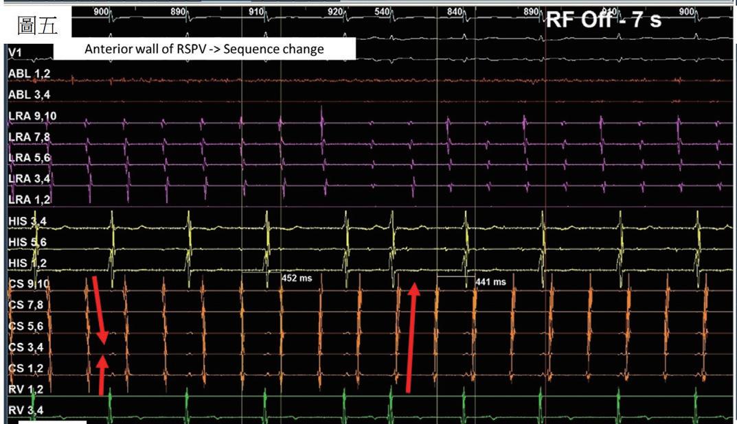 (圖五)、 Mapping後判斷可能之critical isthmus位 於right superior pulmonary vein開口之後 側與前側。針對這兩個位置電燒後,發 生第二次訊號序列變換,轉變為CS 1,2往 CS 9,10之走向。