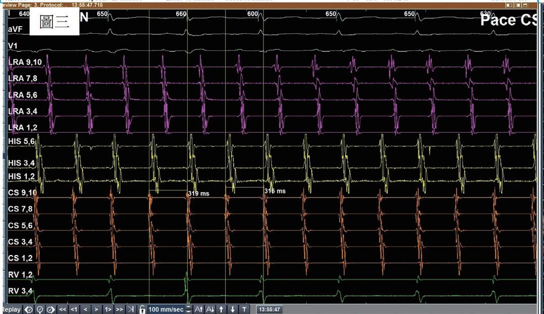 一位 76 歲女性,有高血壓以及陣發性心房顫動病史,規律於心臟科門診服用抗心律不整藥物 (flecainide) 以 及抗凝血劑 (apixaban) 以控制慢性病。然而,病人最近數月來感到間歇性胸悶與心悸,且症狀逐漸加重。經血 管介入專家排除冠狀動脈狹窄阻塞之問題後,判斷此病人之不適與多種嚴重心律不整有關 ( 如圖一與圖二 ) ,包 含可能源自於左心房的心房撲動 (atypical atrial flutters) 。經詳細解釋與討論,病人決定入院接受電氣生理檢查 與電氣燒灼治療。術前電腦斷層顯示左心房及左心耳無血栓,左心房有擴大 ( 約為 160 毫升 ) 。手術當日,病人心 律為 counter-clockwise isthmus-dependent atrial flutter( 如圖三 ) ,利用 entrainment method ,冠狀竇近端比遠端更 近 flutter circuit , 3 維傳播路徑圖為逆時針旋轉路徑。但是在 cavo-tricuspid isthmus 阻斷後, flutter 並未停止,發 生了訊號序列以及 cycle length 的變化,此時右側心房沒有辦法找到合適 entrainment 位置,經兩心房 3 維傳播路 徑圖判定病人之心律不整已轉變為源自左心房後壁之 atypical atrial flutter ,但是在左心房後壁阻斷後, flutter circuit 和 cycle length 仍不斷改變。在左心房經歷如同警匪追逐戰一般的多次阻斷以及訊號序列轉變後 ( 如圖四至 圖六 ) ,終於在冠狀竇 (coronary sinus) 遠端完成此病人的心律不整電氣燒灼手術 ( 如圖七 ) ,且無法再誘發。此病 人之心房撲動訊號序列變化與燒灼相關整理如圖八。術後病人恢復良好,胸悶心悸感已完全消除,固定於門診 領取抗凝血劑與低劑量抗心律不整藥物持續服用併追蹤。