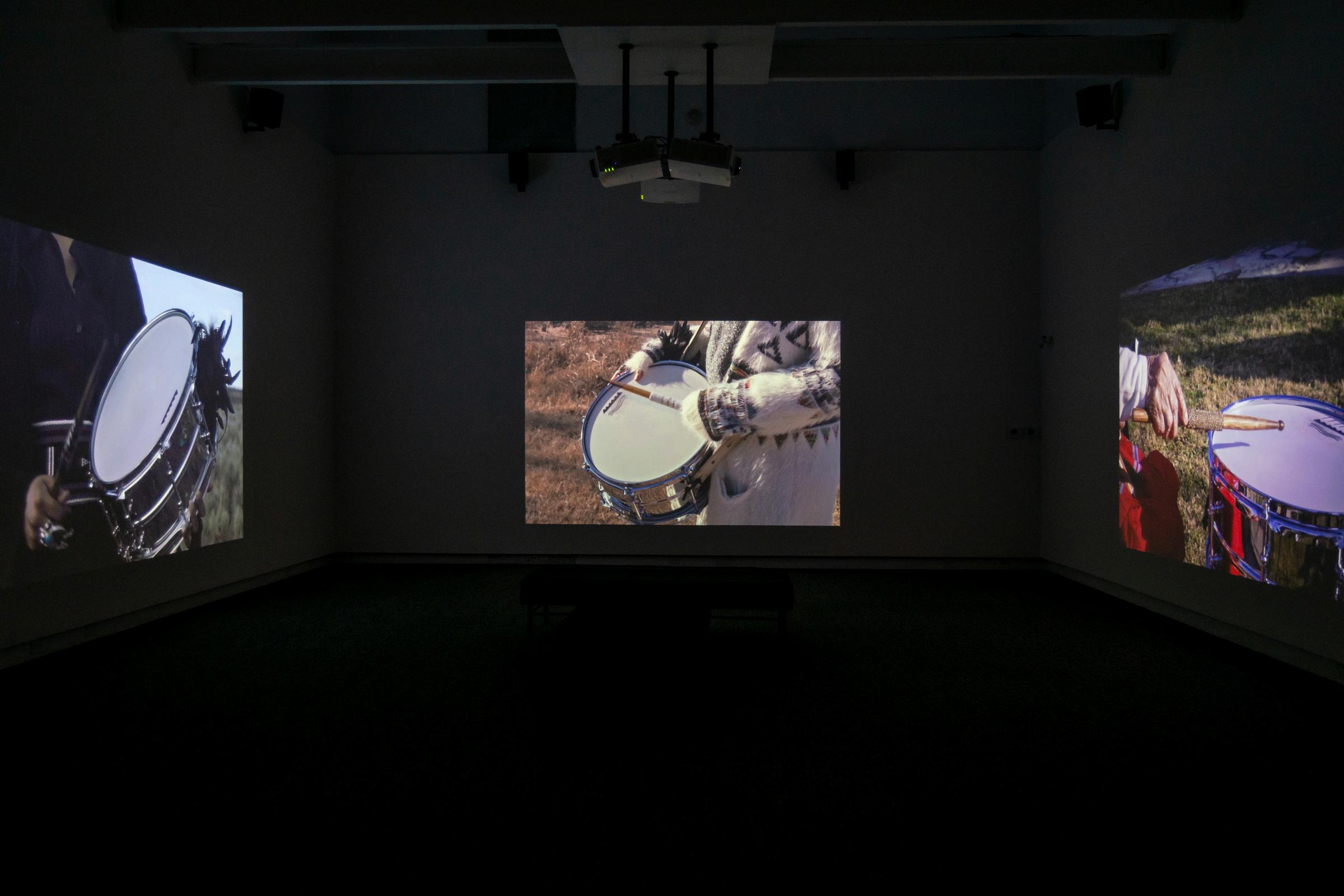 Pulitzer Prize-winning artist Raven Chacon transforms sound into embodied memory. In “Three Songs (2021),” Chacon constructs a deeply affecting meditation on loss, resilience, and Indigenous resistance. Projected across three channels in an unending loop, the work features Indigenous women Sage Bond (Diné), Jehnean Washington (Yuchi), and Mary Ann Emarthle (Seminole), each returning to and performing at sites scarred by histories of displacement, forced removal, and erasure. Their voices,sungintheirmothertonguesandaccompanied only by a snare drum, reverberate through the landscapewithbothmourninganddefiance.