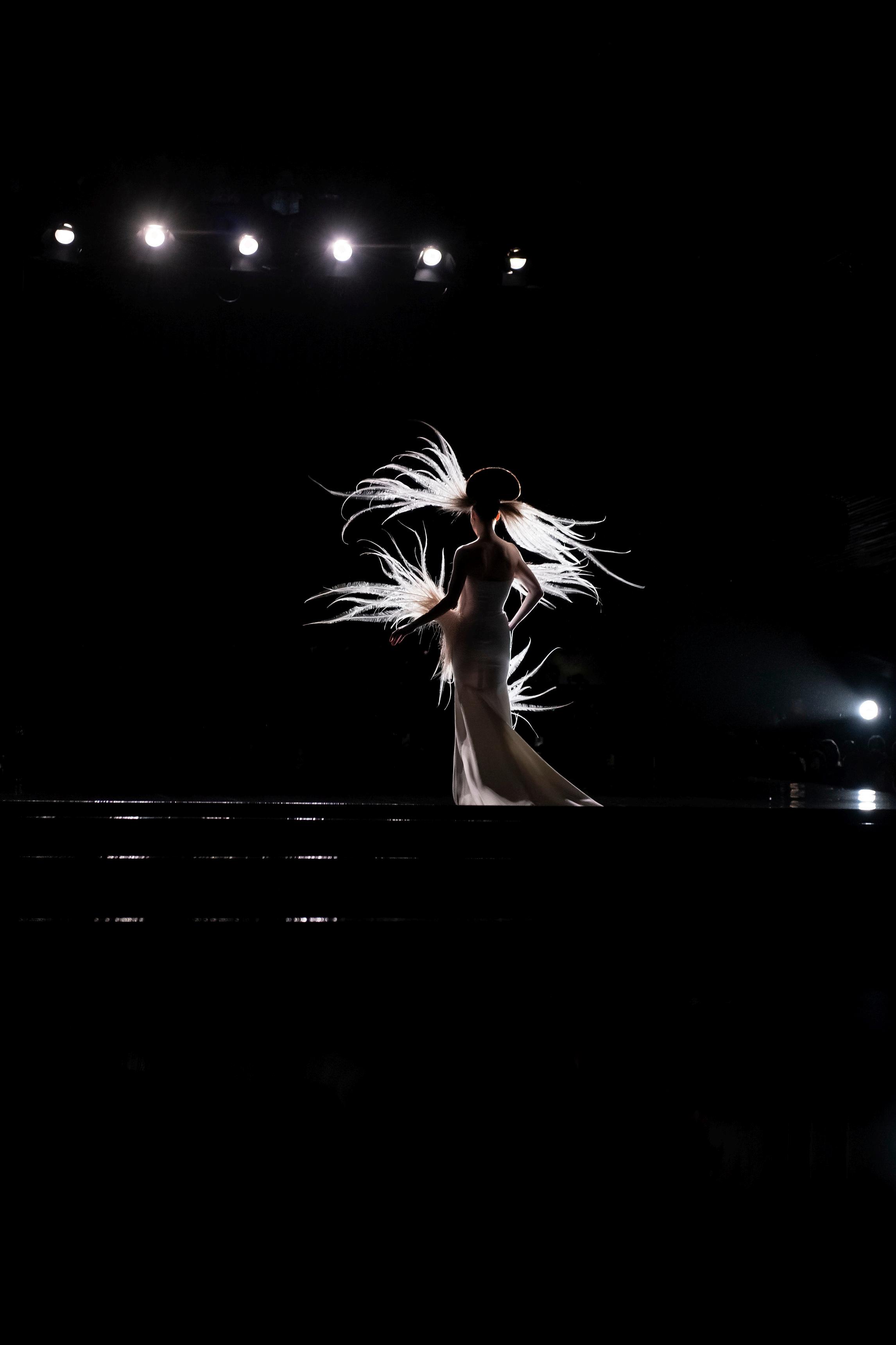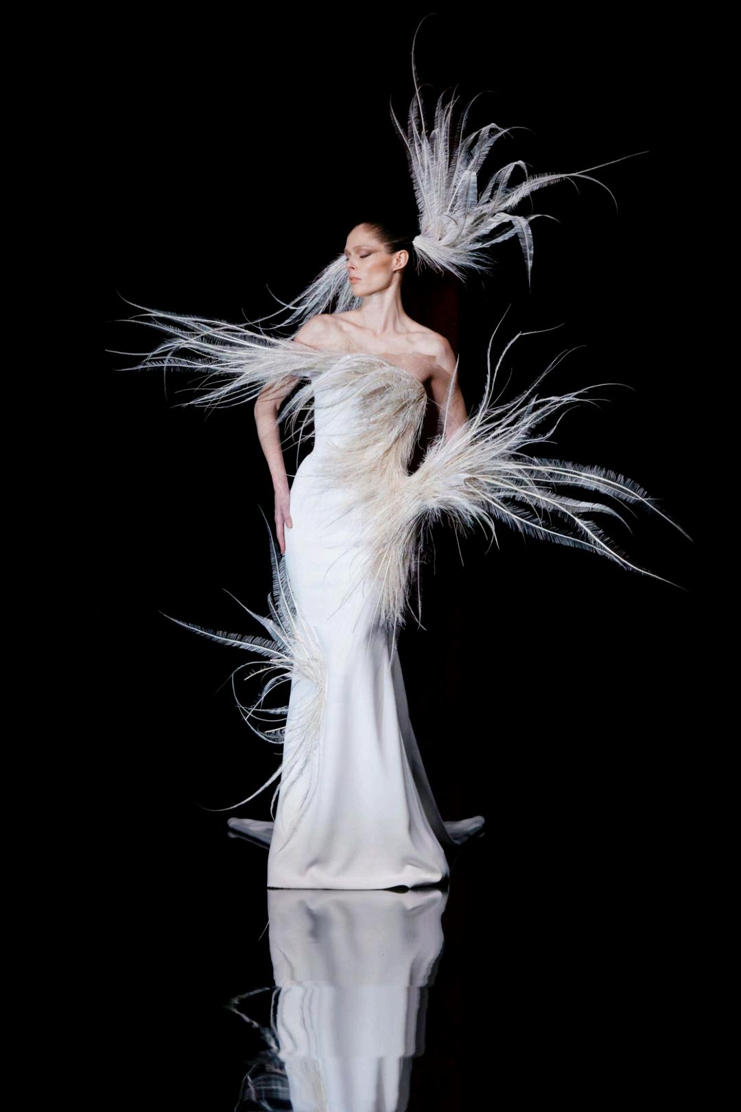 Stéphane Rolland’s “Bridal Dress,” an ivory column entwined with sweeping plumes, embodies this ethos. Its feathers erupt from the body like kinetic brushstrokes, freezing motion in air, a study in balance between restraint and exuberance, between body and sculpture. Devotion becomes visible through material: the precision of tailoring, the fragility of featherwork, thearchitecturalpurityofsilhouette.