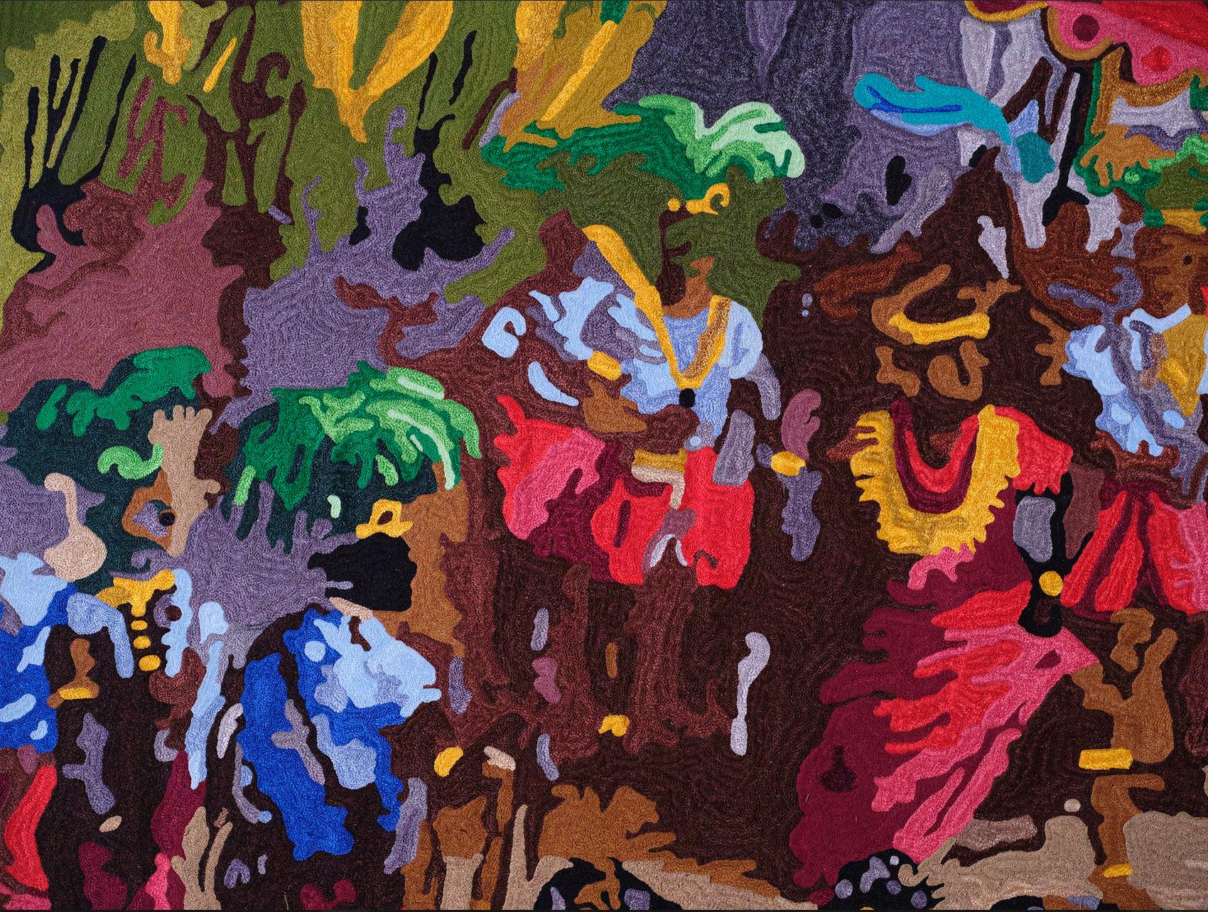 TC:Yourtapestriesreadalmostarchitecturally;theyshape how viewers move and look. What does working at this scale allow you to articulate about sovereignty, presence, andhistoricalvisibility?