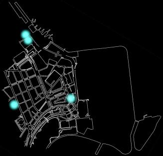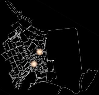 The map shows the floating active population plot resulting from the overlay of the service offer maps over the course of a working day ( in Purple ) and the route of the landscape design intention around the remaining court ( in Pink ). It can be seen from the map that the remaining block does not have enough attractions to be part of the floating active population's route. The points of attraction ( in white) are located at: Praça Mercado Municipal , Praça XV , Praça Mário Lago , Av. Eramos Braga , Rua Santa Luzia (in front of Santa Casa) , Av. Churchill , Av. Franklin Roosevelt , Intersection Av. Ântonio Carlos and Av. Beira Mar , Museum of Modern Art.