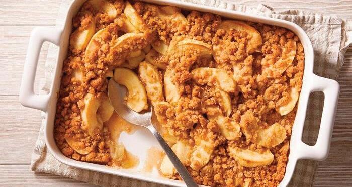 Preheat oven to 375°. Place apples in a large bowl. Combine sugar and 1/2 teaspoon cinnamon; sprinkle over apples and toss to coat. Transfer to a greased 13x9-in. baking dish. Combine flour, brown sugar, oats, baking powder, nutmeg and remaining 1/2 teaspoon cinnamon; cut in butter until mixture resembles coarse crumbs. Sprinkle over apples. Bake until apples are tender, 50-60 minutes. Serve warm, with vanilla ice cream if desired.