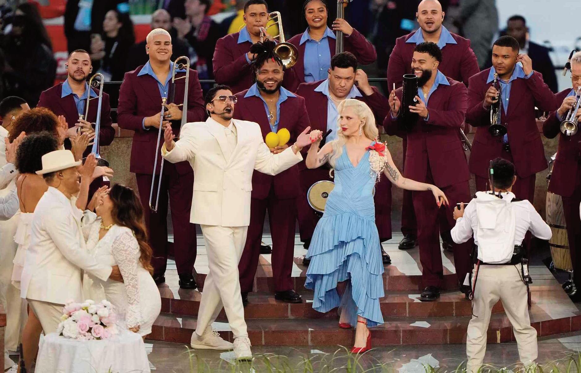 .El rapero de 31 años, nacido Benito Antonio Martínez Ocasio, encabezó el evento musical 2026 en el Big Game el domingo 8 de febrero en el Levi's Stadium de Santa Clara, California, donde interpretó un popurrí de canciones Para iniciar su actuación, que reflejaba aspectos de su residencia No Me Quiero Ir de Aquí, cantó "Tití Me Preguntó" antes de hacer la transición a "Yo Perreo Sola". Después de pasar del campo de caña de azúcar a la barbería y licorería, Bad Bunny actuó en lo alto de La Casita, que contó con apariciones sorpresa de celebridades como Pedro Pascal, Cardi B, Jessica Alba, Karol G, Young Miko, Cardi B y más. Bad Bunny también cantó un fragmento de “VOY A LLeVARTE PA PR” Luego aterrizó de emergencia en La Casita y abrió la puerta de una patada antes de dirigirse a un mar de bailarines que disfrutaban de una fiesta en la calle para interpretar "EoO" A lo largo del set, también utilizó fragmentos de "Pa' Que Retozen" de Tego Calderón, "Dale Don Dale" de Don Omar y "Gasolina" de Daddy Yankee Bad Bunny trajo sorpresas: Lady Gaga apareció en el escenario con un vestido azul para interpretar una interpretación en salsa de su éxito "Die with a Smile", antes de que Bad Bunny se lanzara a cantar "BAILE INoLVIDABLE" y "NUEVAYoL". En un momento de la actuación, apareció una pareja casándose, y Bad Bunny incluso le dio su Grammy a un niño que lo miraba por televisión Luego apareció Ricky Martin interpretando "LO QUE LE PASÓ A HAWAii" de Bad Bunny. Bad Bunny cerró el espectáculo interpretando “El Apagón", "CAFé CON RON" y DtMF". Cerca del final del espectáculo, dijo: "Dios bendiga a América, Dios bendiga a Puerto Rico, Dios bendiga a México" y continuó enumerando los países latinos mientras convertía el campo en un desfile con fuegos artificiales.Detrás de él, había un cartel que decía: "Lo único más poderoso que el odio es el amor"