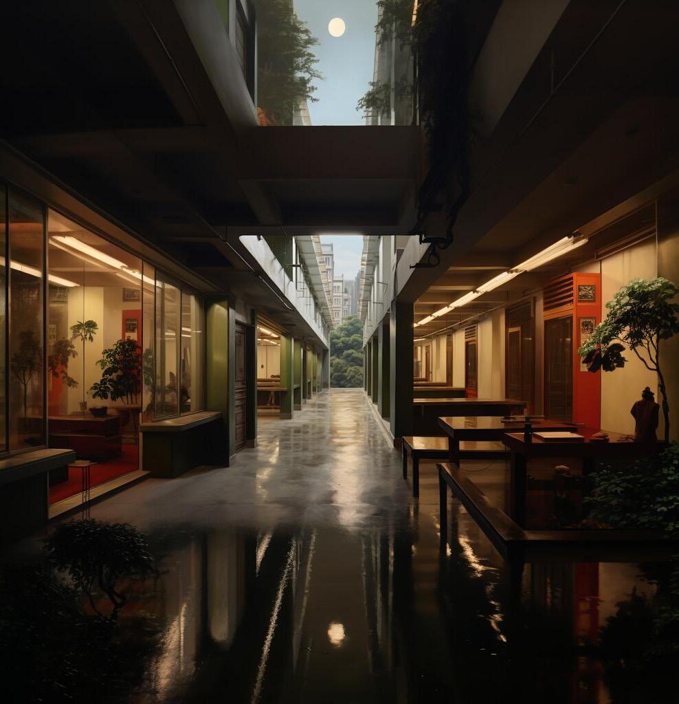 https://s.mj.run/74bK2-2mWZc A residential building with vibrant walkway spaces in which people talk and banter with each other through interior windows, and children laugh and play in and out of the rooms in Hong Kong, in the style of george ault, paul delvaux, realistic chiaroscuro lighing, imaginative scenes, monochromatic masterpieces, solarizing master, Backlighting, life-like, realistic --iw 2 --s 1000 –style raw --r 10