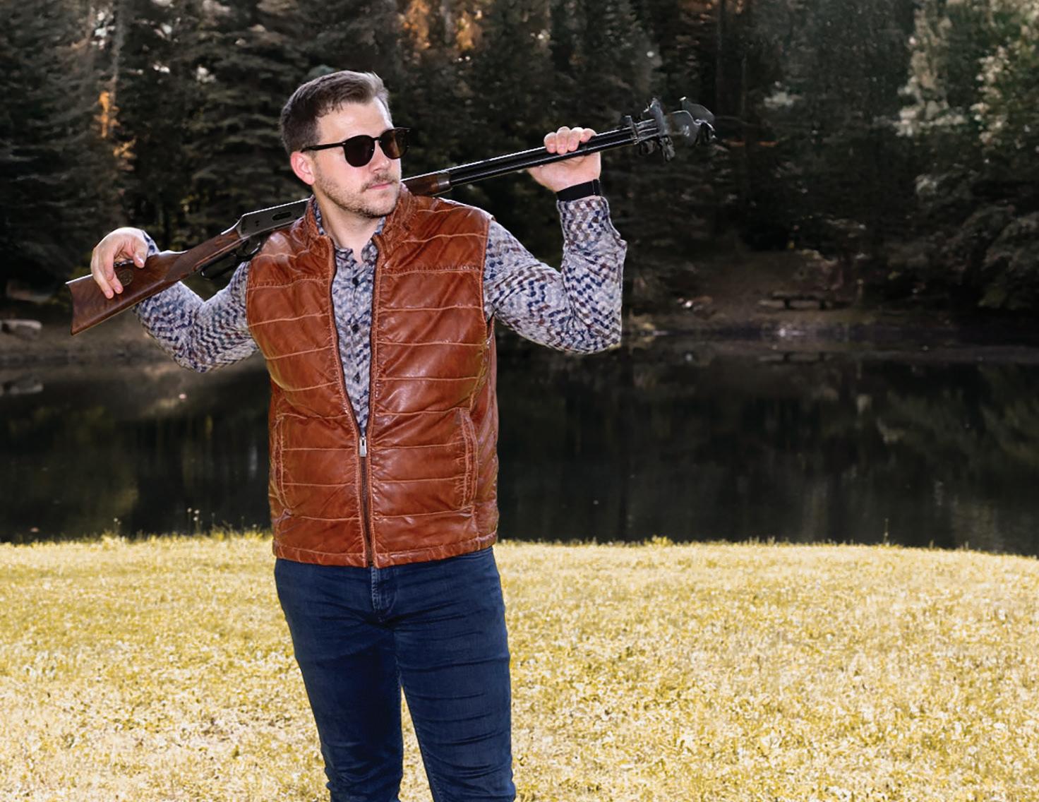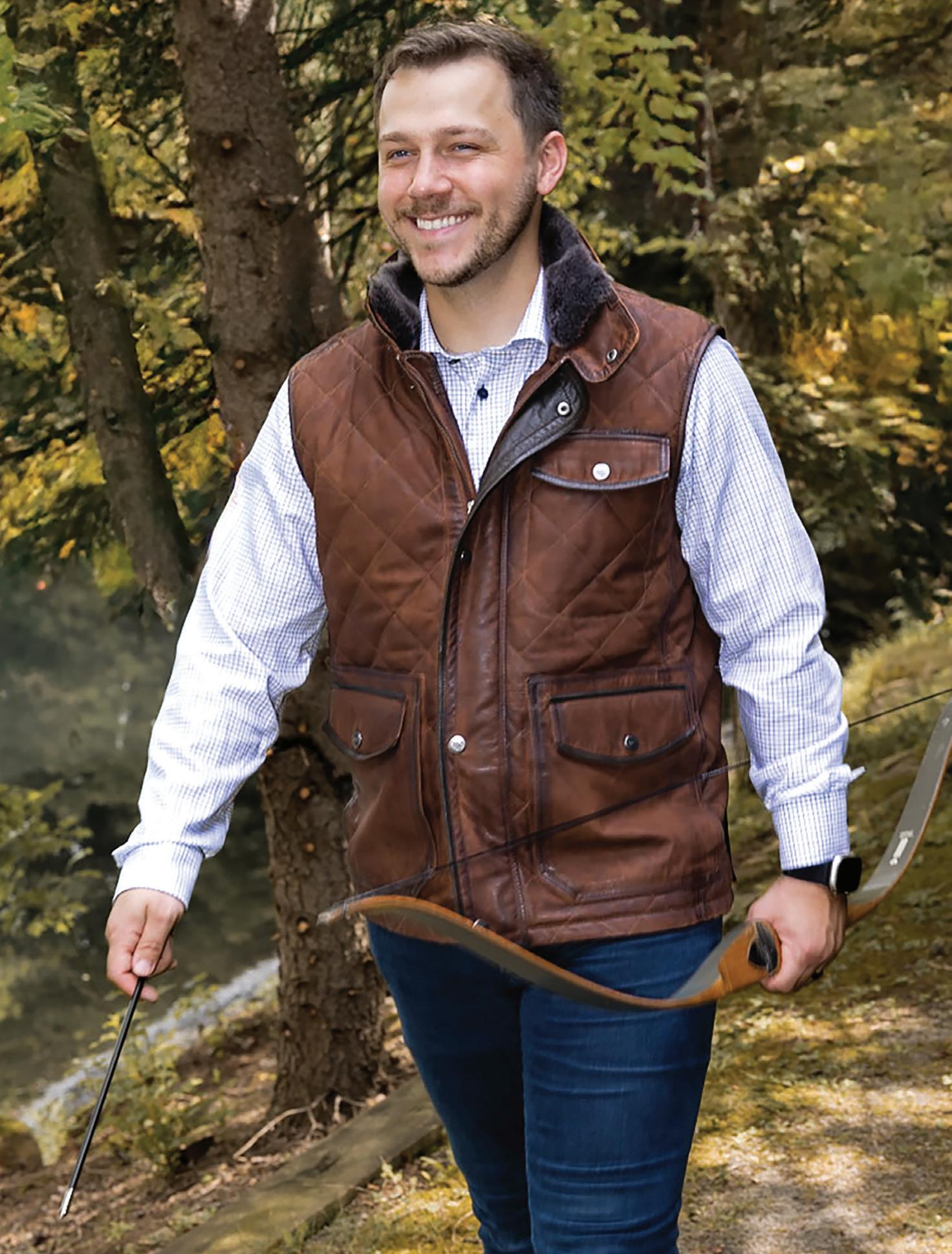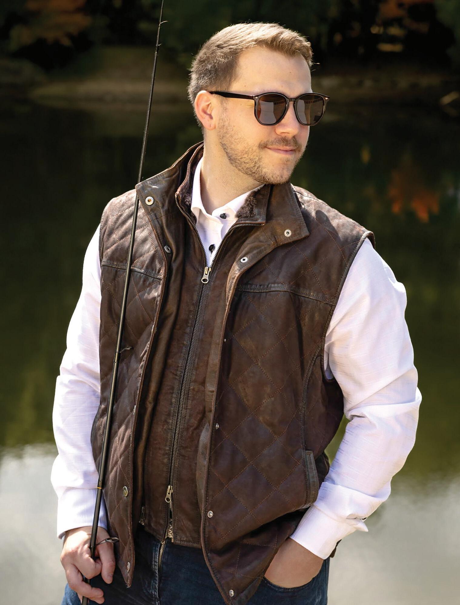 a.) Madison Creek | 100% Goatskin leather quilted vest with side entry pockets. | Chocolate. | BVRCRK Sizes: M-3XL $750
