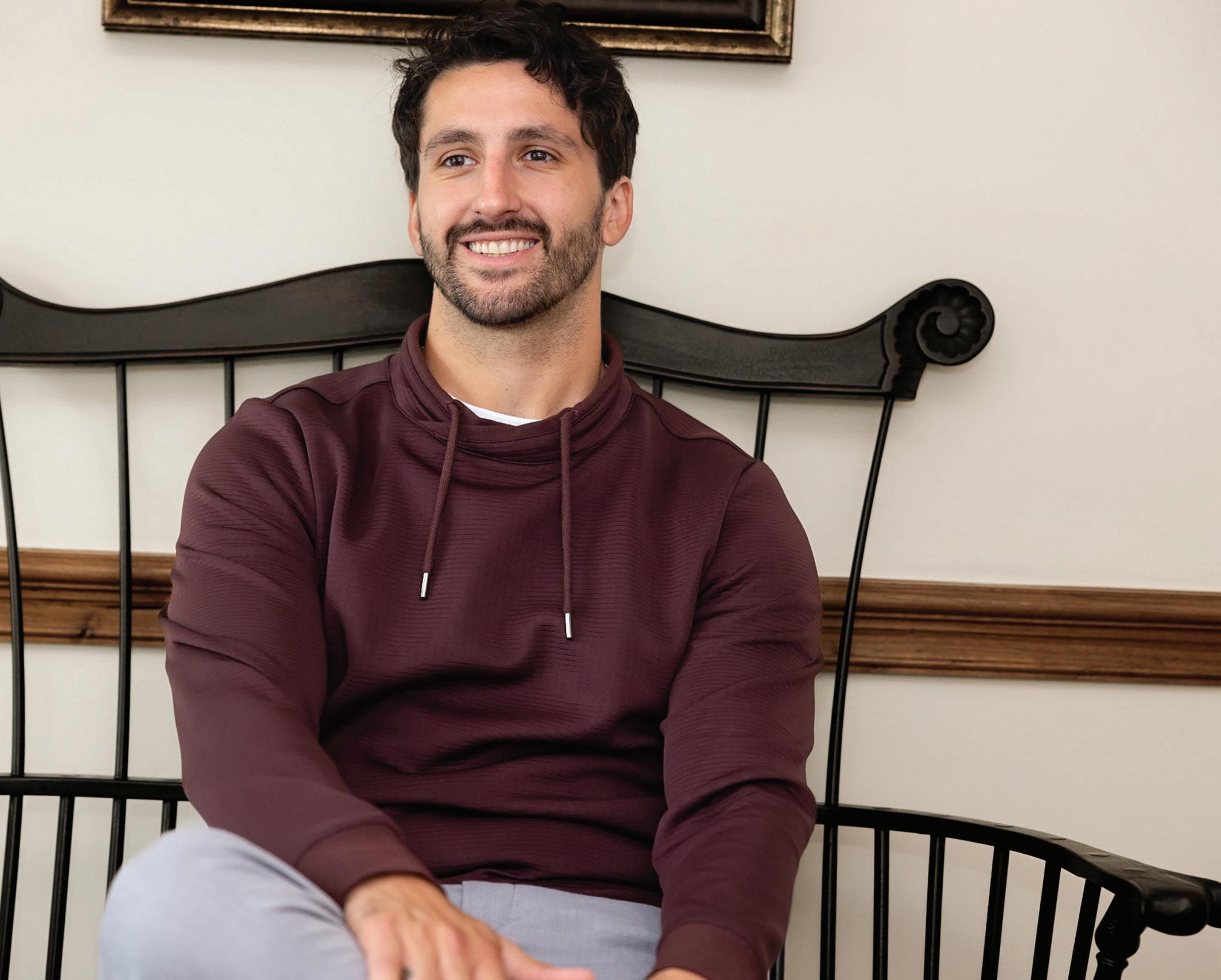 b.) Robert Barakett | Knit crossover neck sweater. | Bordeaux. | DRYTN-BRDX Sizes: S-2XL $150