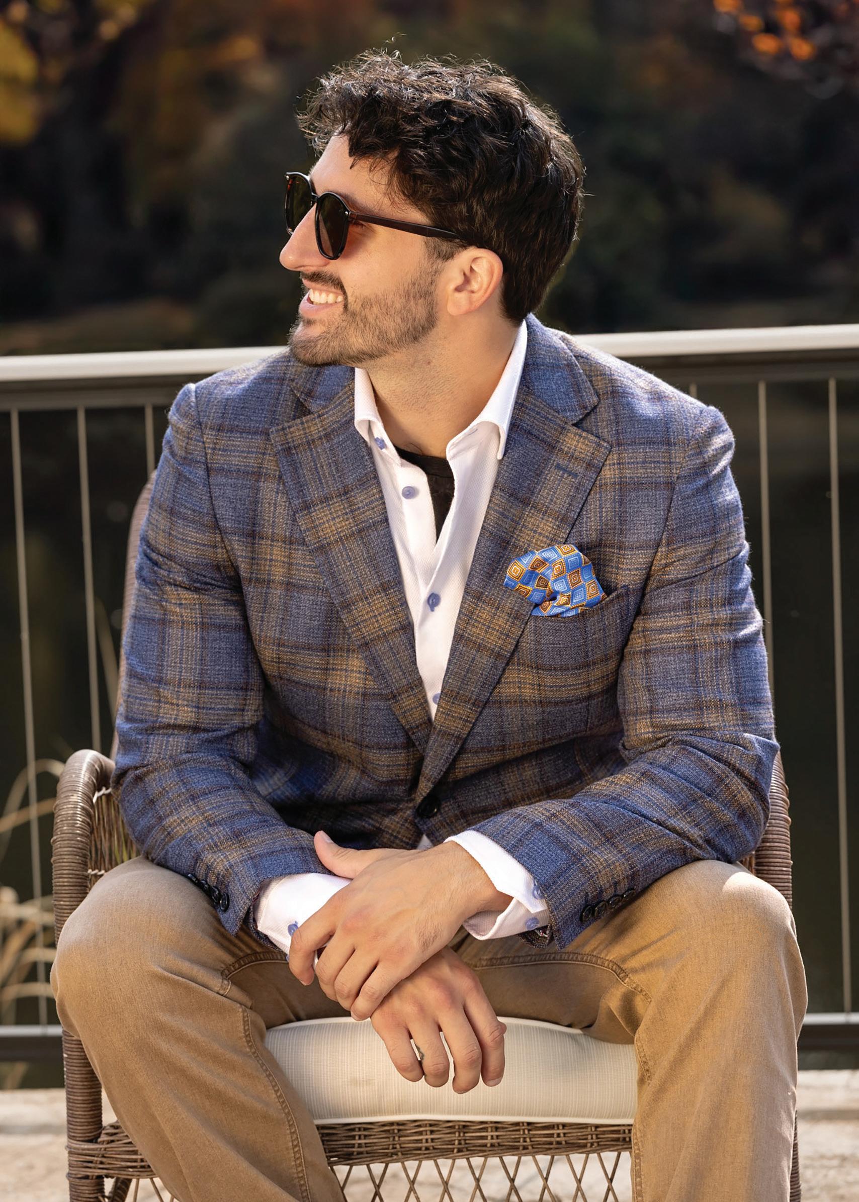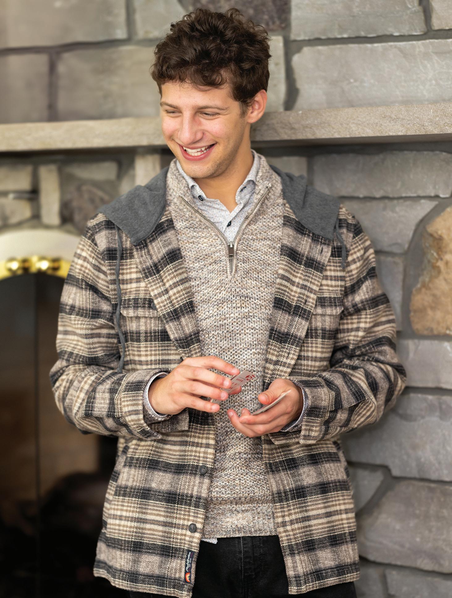 a.) TailoRed | 7% Cashmere, 93% Wool-laine notch lapel sport coat. | Gray and Navy plaid. | 8150439 Sizes: 40-54R, 38-44S, 42-52L $850 $799.99