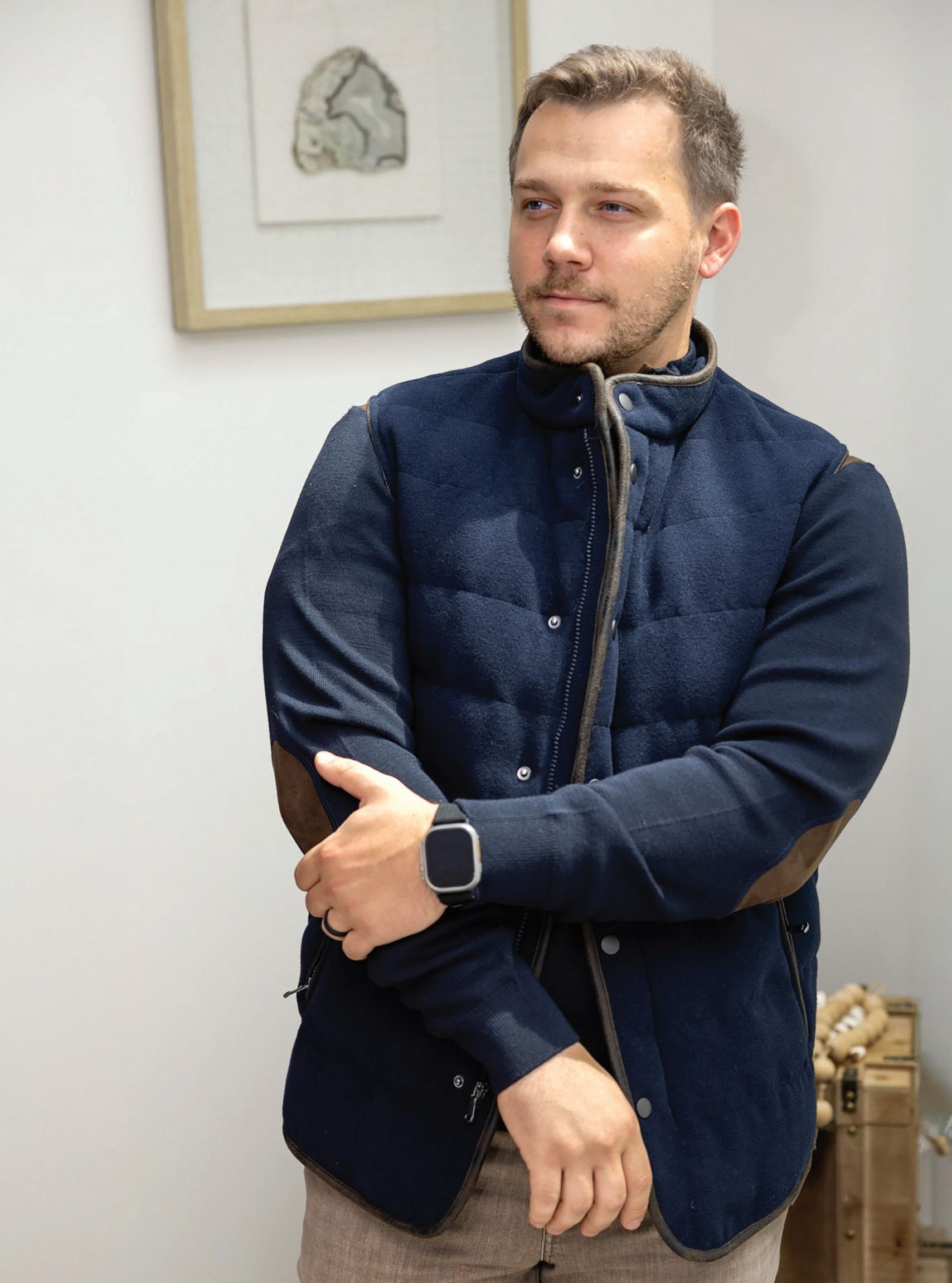 c.) Enzo | Quilted vest. | Navy with brown trim. | HAMPTON Sizes: S-2XL $125
