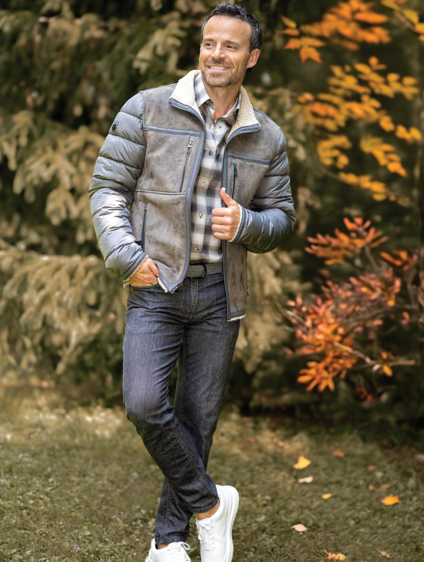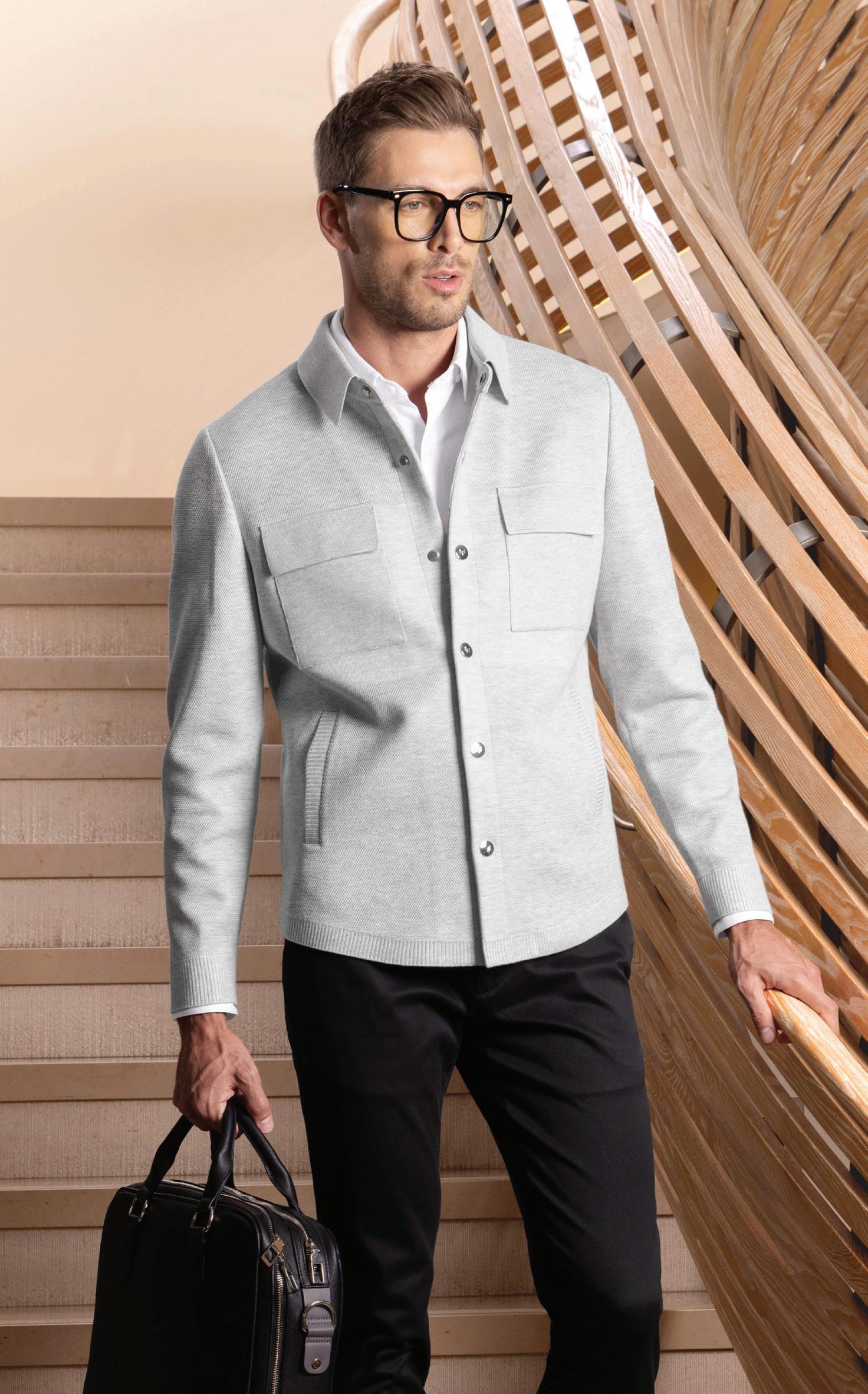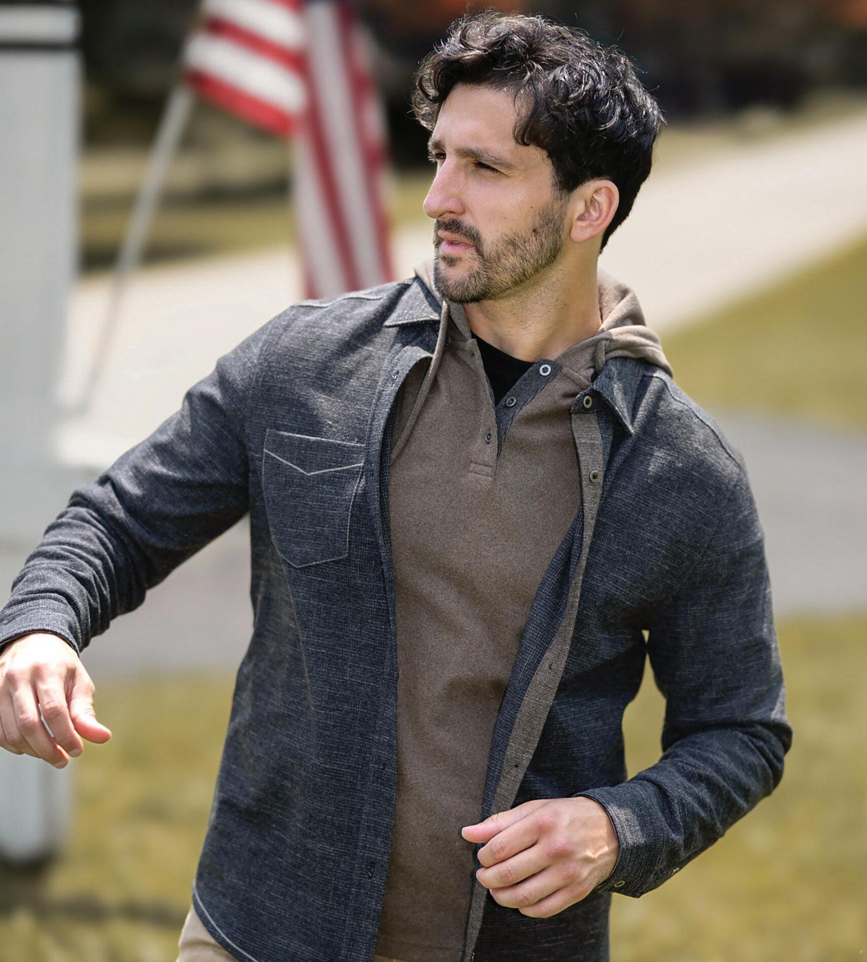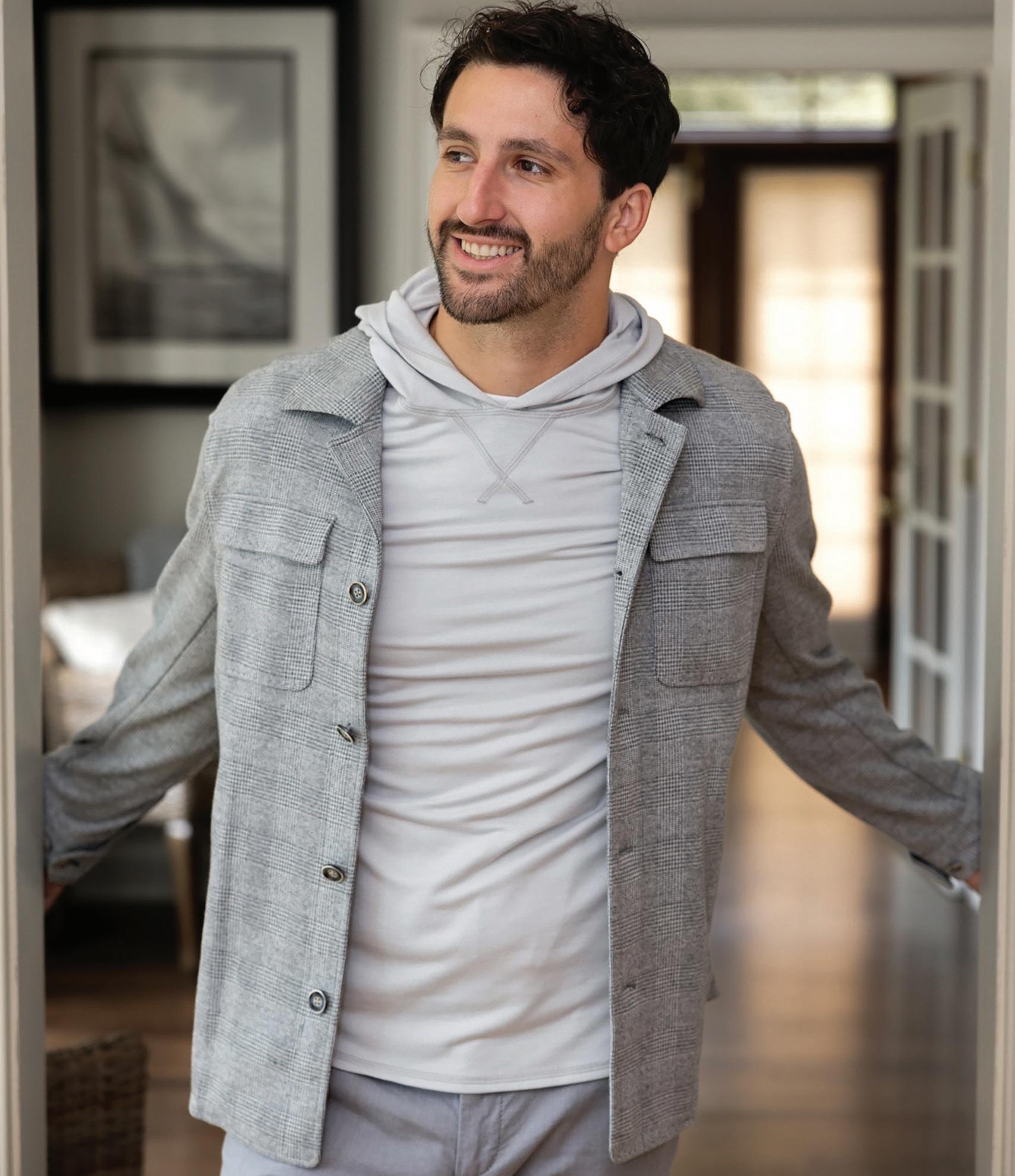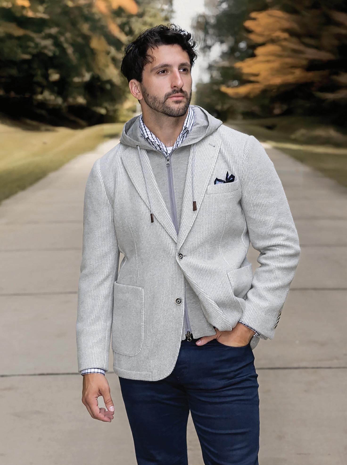 a.) Alberto Zimni Signature | Hooded hybrid sport coat with a removable storm system front. | Gray. | H200-GRY Sizes: 38-52, 38-40S, 46L $599.95