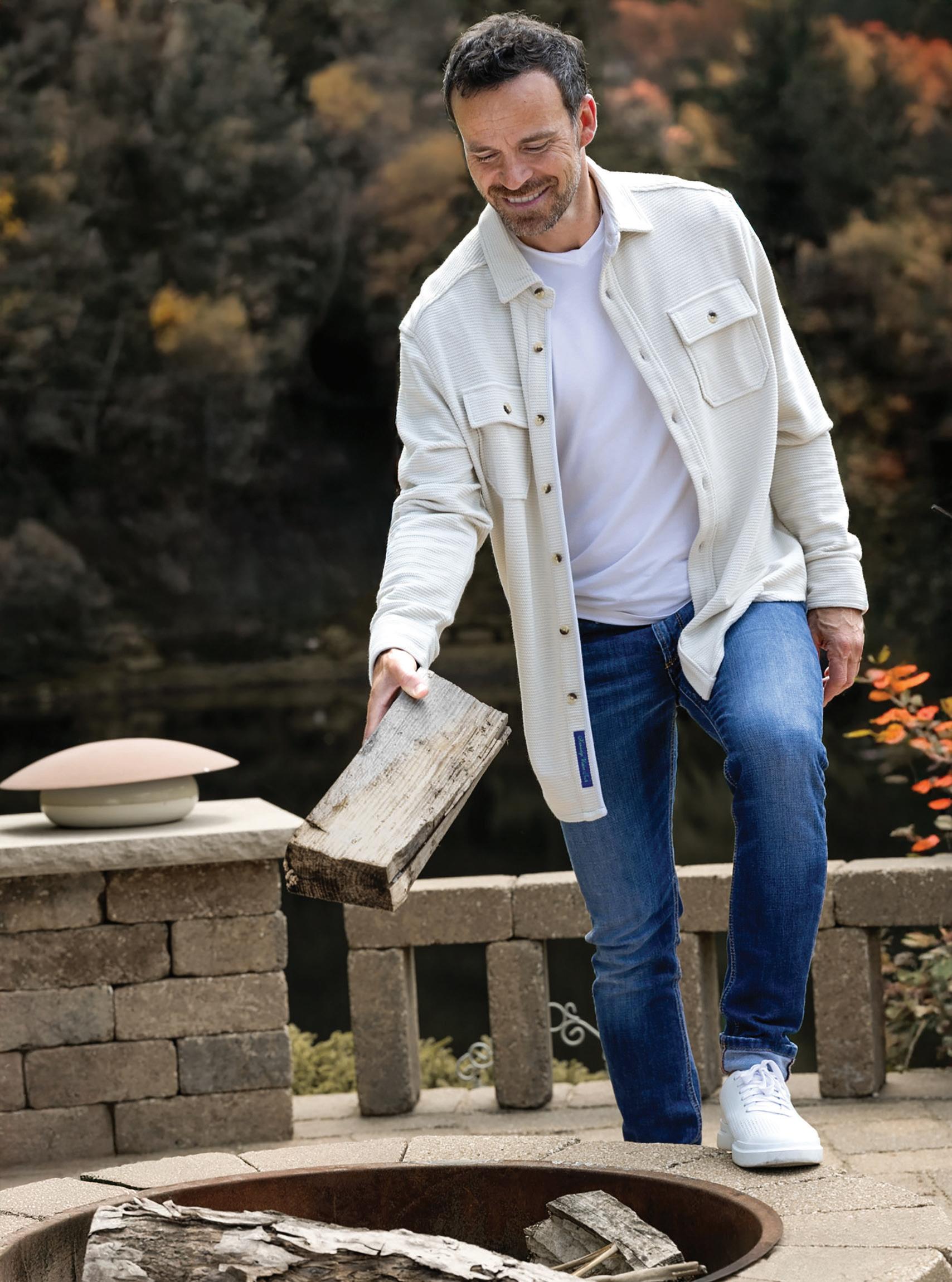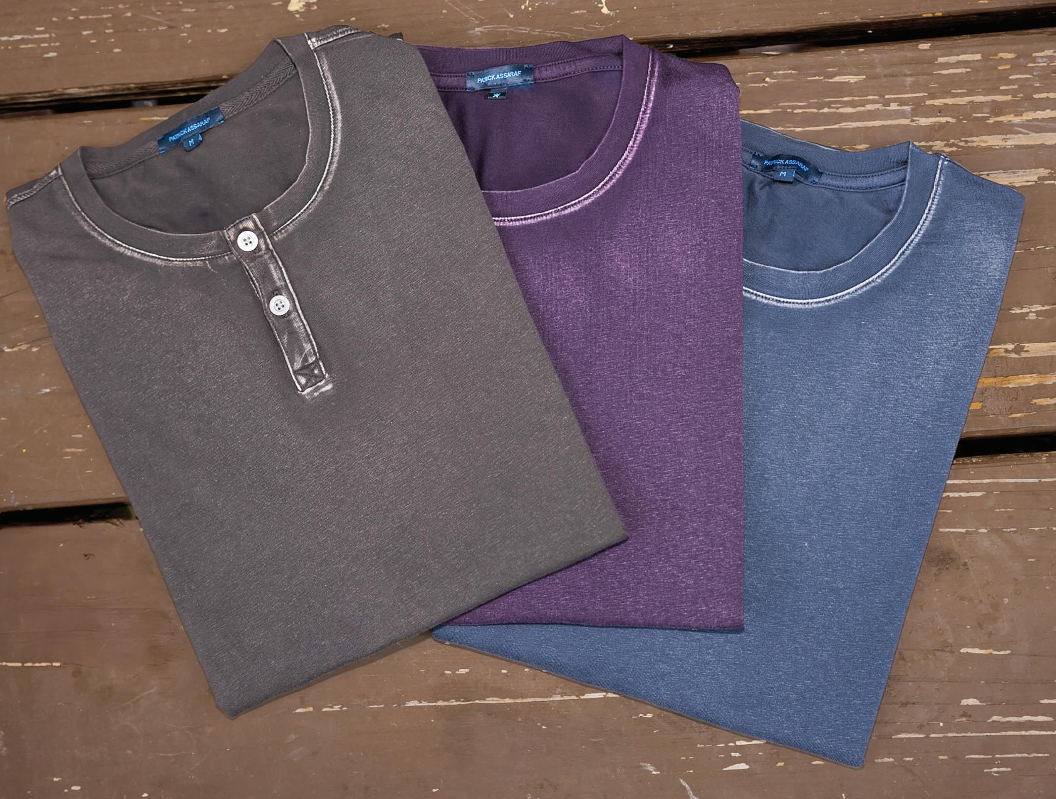 e-f.) Patrick Assaraf | 95% Pima cotton vintage washed long sleeve shirt. Sizes: M-XL $150