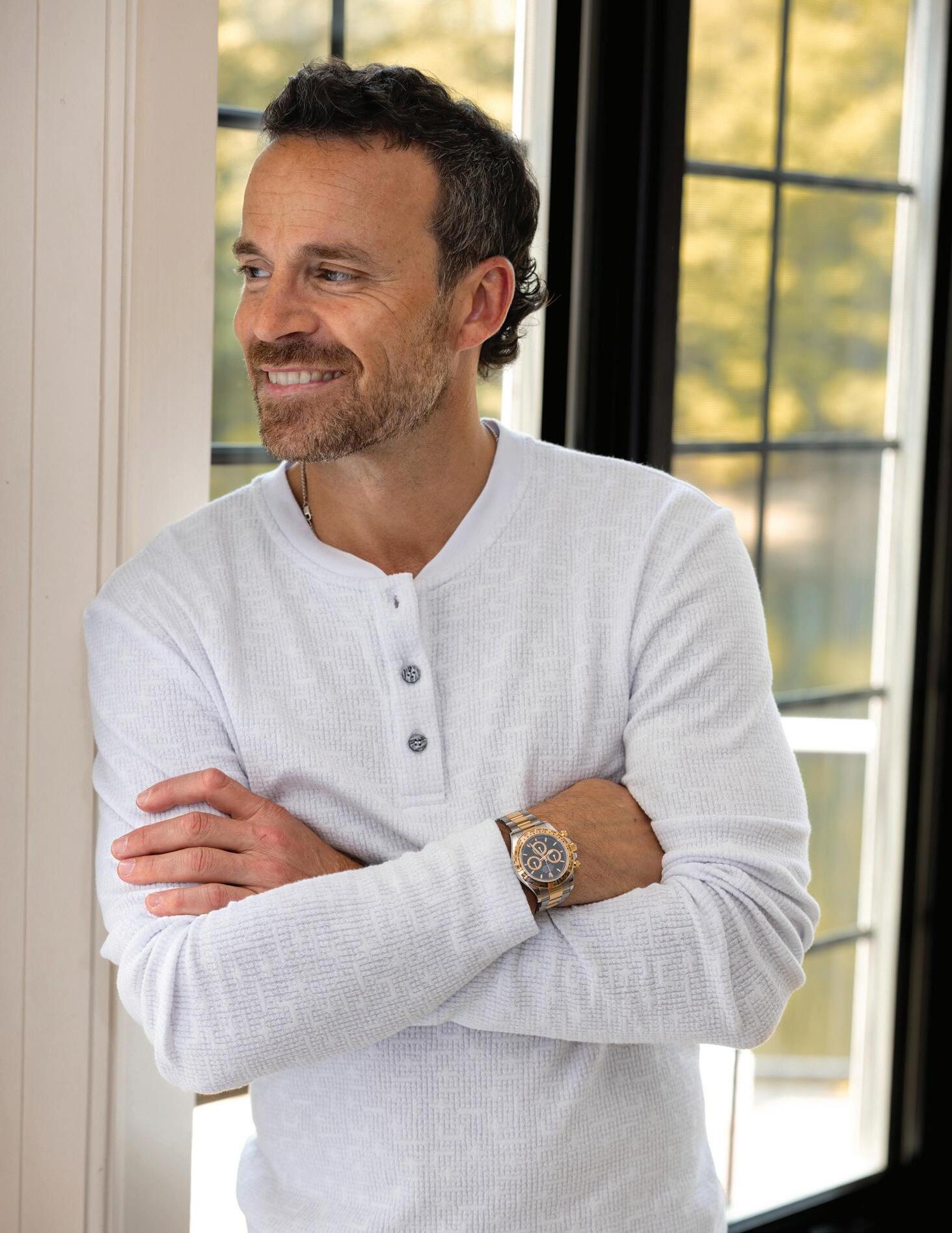 d.) Patrick Assaraf | 95% Pima cotton henley sweater. | Washed Barley. | P95F13 Sizes: M-XL $175