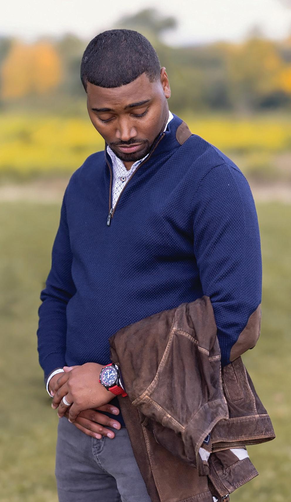 b.) Navy henley sweater with accent placket. | 2422028-4