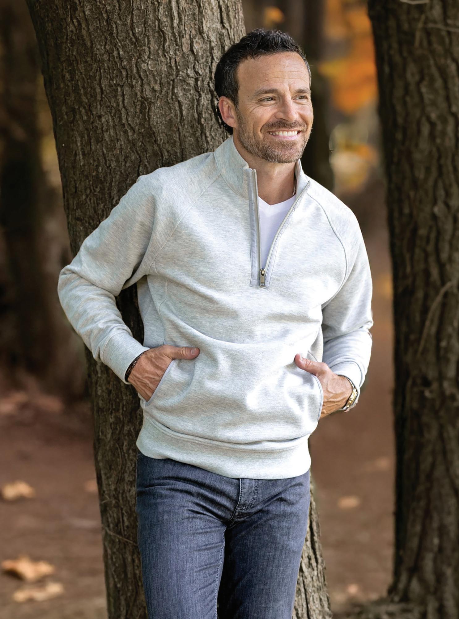 a.) Bugatchi | Cotton-blend quarter zip sweater with kangaroo pockets. | Cement. Also available in Black. | FF2404K41 Sizes: S-2XL $179