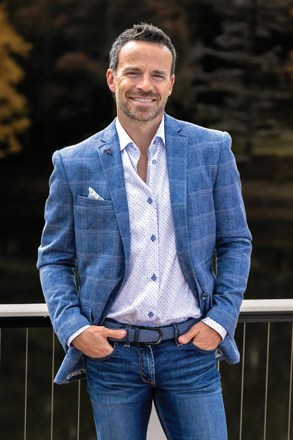 d.) Fred’s Fine Threads | Cottonblend, two-button closure sport coat. | Navy checkered pattern. | 98-1102604 Sizes: 38-52 $495