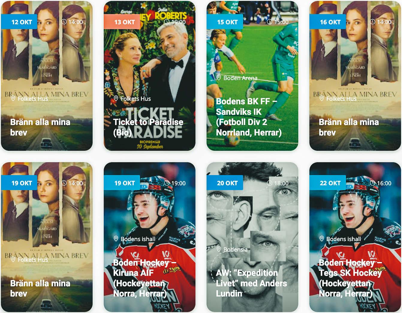 Läs mer på boden.gratistidning.com - Med reservation för ev. ändringar av tider, datum och priser. VARJE VECKA I DIN GRATISTIDNING Nöje & Evenemang OBS! Det är gratis att lägga in evenemangen! - länk via QR-kod. HOTELL | KONFERENS | RESTAURANG | EVENT | CAMPING LÄS MER OCH BOKA PÅ STORFORSEN.SE/EVENEMANG NÖJESPAKET 1915 SEK/PERSON Showentré | Trerätters supémiddag | Boende del i dubbelrum | Frukost 4 & 5 NOVEMBER Wallmans_124x182.indd 1 2022-09-26 11:57:21 EvenemangNöje & 17