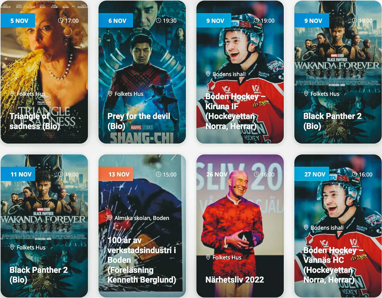 Läs mer på boden.gratistidning.com - Med reservation för ev. ändringar av tider, datum och priser. VARJE VECKA I DIN GRATISTIDNING Nöje & Evenemang OBS! Det är gratis att lägga in evenemangen! - länk via QR-kod. INTERNATIONELLA BOXNINGAR HILDURSBORG Garnisonsgatan 1, Boden Lördag 5 nov kl. 14.00 Välkomna! Fri entré För mer information ring 070-678 65 37 Varmt välkomna! Storforsens Julmarknad 26 - 27 november kl. 11.00 - 16.00 i naturreservatet Julmarknad_124x182.indd 1 2022-10-28 10:11:43 EvenemangNöje &