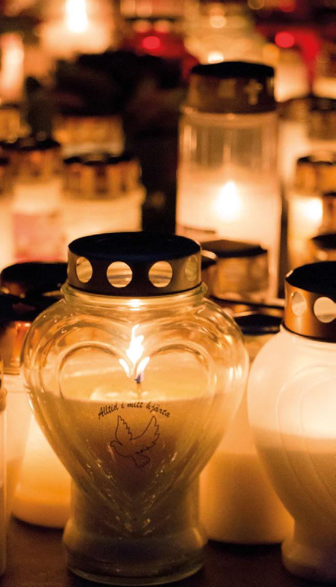 Du kan också välja att minnas nära och kära genom att tända ljus hemma och ha kontakt med närstående, tända ett digitalt ljus på bönewebben eller delta i en digital minnesgudstjänst.