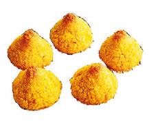 Smält smöret och blanda ner saffran och apelsinskal, låt svalna lite. Rör ihop ägg och socker i en bunke. Blanda ner kokos och smöret. Låt smeten stå ca. 10 minuter i kylskåp. Sätt ugnen på 175°C. Forma smeten till 20 toppar på en bakpappersklädd plåt. Grädda i mitten av ugnen 12-15 minuter.