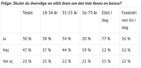 Äldre och låginkomst tagare påverkas mest I svaren syns också klara demografiska skillnader. Bland 56-79-åringarna är det nästan sex av tio (59 %) som inte skulle överväga ett elbilsköp utan en bonus. 18-34-åringarna är betydligt mer motiverade, där är siffran 37 procent. Köpviljan minskar även med inkomsten. 52 procent av de som tjänar upp till 25 000 kronor i månaden skulle ge elbilen nobben om det inte fanns en bonus. Motsvarande siffra bland de som tjänar över 35 000 kronor är 41 procent.
