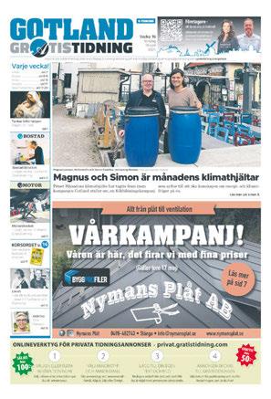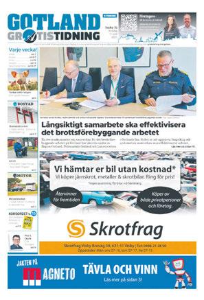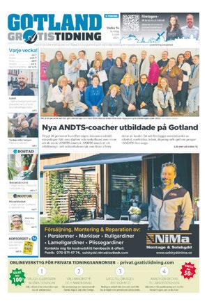 Tryck: Pressgrannar. Upplaga 30.200 ex. Ansvarig utgivare : Peder Gidlund, peder.gidlund@gratistidning.com Annonspriser: www.gratistidning.com Distribution: Alla hushåll med varannandagsutdelning enligt PostNords regler. Normal vecka delas tidningen ut på torsdagar och fredagar fram till kl. 17.00. Nästföljande vecka byter område 1 och område 2 plats. Vid missad utdelning på torsdag sker komplettering måndag och missad utdelning på fredagar blir då tisdag. Betalningsvillkor: 10 dgr netto. Efter förfallodagen debiteras ränta med gällande diskonto +8%. Utgivningsdag: Torsdagar. Manusstopp: Privatannons fredag 15.00. Företags- och föreningsannonser fredag kl 12.00. Annonsgranskning: Gotland Gratistidning förbehåller sig rätten att avböja olämpliga annonser. Reklamationer: Reklamationer beträffande annonser skall göras inom 3 dgr, beträffande fakturor inom 10 dgr. För fel i annonser, som avlämnats till Gotland Gratistidning per telefon är tidningen utan ansvar för eventuell skada på grund av uteblivet eller felaktigt införande eller fördröjda annonssvar. Gotland Gratistidning ansvar är begränsat till högst annonskostnaden. Organisationsnummer: Gotland Gratistidning ges ut av Svenska Civildatalogerna AB, 556348-5928. Copyright ©: Observera att annonser i Gotland Gratistidning innefattas av Copyright (upphovsrätt). Får ej införas i annat media utan tillstånd. www.gratistidning.com
