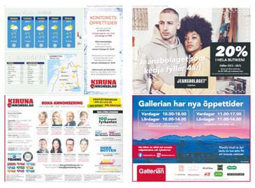 peder.gidlund@gratistidning.com PRIVATANNONSER - GRATIS Webb: kiruna.gratistidning.com SOCIALA MEDIER - FÖLJ OSS Facebook: @KirunaAnnonsblad Instagram: #KirunaAnnonsblad Boka annons eller frågor - välkommen att kontakta oss! BOKA ANNONSERING Ni kan även gå in på boka.gratistidning.com eller skicka e-post till boka@gratistidning.com. Varje vecka Upplaga 82 000 ex Fyra nummer / år Upplaga 110 000 ex norrbotten.com Sommartidning vecka 27 Upplaga 122 500 ex Norgetidning vecka 21 Upplaga 165 000 ex ÄNNU STÖRRE SPRIDNING Annonspaket Varje månad (löning) Upplaga 146 500 ex Annonspaket Glad Sommar ake.tapani@ gratistidning.com monica.stube@ gratistidning.com 070-590 95 69 peder.gidlund@ gratistidning.com Alexandra Granström alexandra.granstrom@ gratistidning.com roine.soderlind@ gratistidning.com Maria Salonen 070-620 99 22 maria.salonen@ gratistidning.com victoria.timander@ gratistidning.com 4°C -1°C 3 m/s MÅNDAGTORSDAG FREDAG LÖRDAG LOKALT VÄDER - KIRUNA 5°C 2°C 5 m/s 7°C 2°C 5 m/s 5°C -1°C 2 m/s 5°C -1°C 4 m/s 6/107/108/109/10 10/10 SÖNDAG STÄDER Umeå 1°C Stockholm 5°C Göteborg 8°C Köpenhamn 8°C Oslo 4°C Helsingfors 7°C London 14°C Rom 16°C Madrid 15°C Paris 8°C TURISTORTER Gran Canaria 20°C Nice 17°C Málaga 19°C Mallorca 19°C Rhodos 21°C Alanya 25°C Bangkok 30°C Dubai 33°C New York 8°C Orlando 19°C TEMPERATUR NORRBOTTEN TORSDAG 6/10 BODEN 9° JOKKMOKK 7° GÄLLIVARE 7° KIRUNA 4° PITEÅ 10° VI INFORMERAR VÅRA MANUSSTOPP för garanterad korrektur torsdagar kl. 12.00 Tryckfärdiga annonser måndagar kl. 15.00 Maila gärna in era bokningar och manus på: annons@gratistidning.com 2