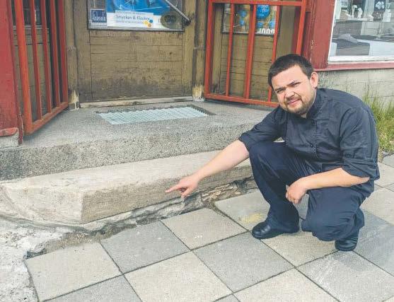 Anders Ramström från Landströms Kök och Bar visar att huset antingen höjt sig eller att trottoaren sjunkit mer än 15 centimeter. Han visar även håligheter i marken runt huset.