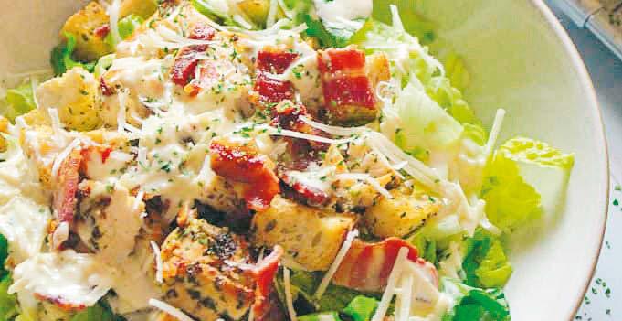 3. Blanda kyckling, Schwarzwaldskinka, roman sallad och Caesardressing. Toppa med riven/fint hyvlad Västerbottensost och krutonger.