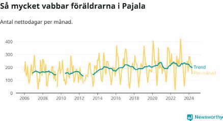 Pajala ligger en bit från ett jämställt uttag. Under de senaste tolv månaderna har männen stått för 36 procent av all vabb i kommunen. Pappornas uttag peakade vintern 2015 då kommunens fäder var uppe i 45 procent av vabbdagarna.