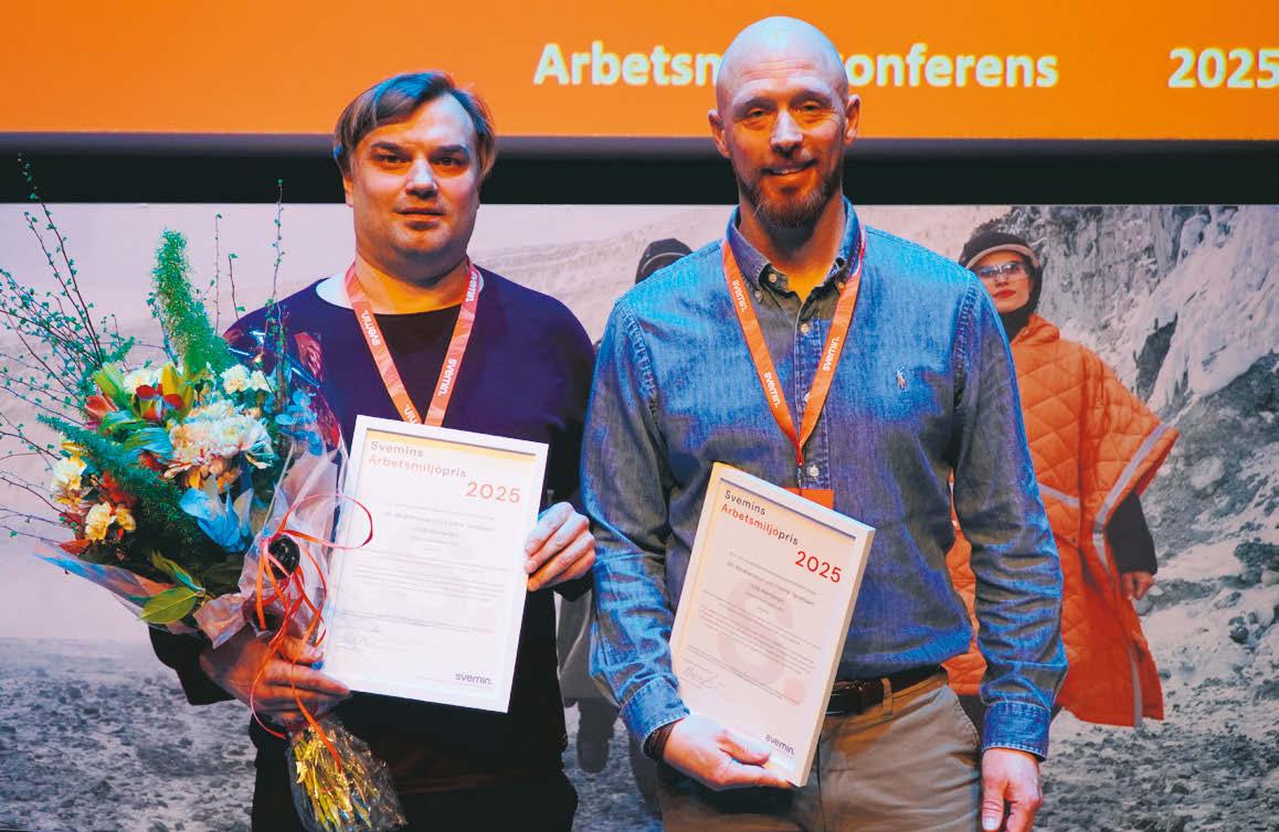 i ständig förbättring med hög trivsel- och trygghetsfaktor. Ett lysande exempel på detta är de arbetsmiljökonferenser de arrangerade under 2024. Med stort engagemang la de ner tid för att få allt att fungera. Det resulterade i konferenser som deltagarna ansåg vara något utöver det vanliga. Arbetsmiljöpriset 2025 går till Jim Abrahamsson och Fredrik Taivalsaari.” ■