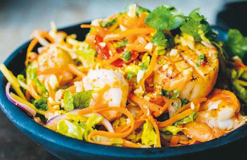 4. Blanda hjärtsallad, morötter, gurka, sockerärtor, rödlök, räkor, pilgrimsmusslor och jordnötter, koriander, mynta och dressing.