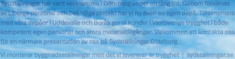 Sydställningar har varit verksamma i Göteborg under en lång tid. Genom förvärvet av Libergs personal och befintliga projekt har vi nu även en egen depå. Tillsammans med våra depåer i Uddevalla och Borås ger vi kunder i Västsverige trygghet i både kompetent egen personal och stora materialtillgångar. Välkommen att kontakta oss för en närmare presentation av oss på Sydställningar Göteborg.
