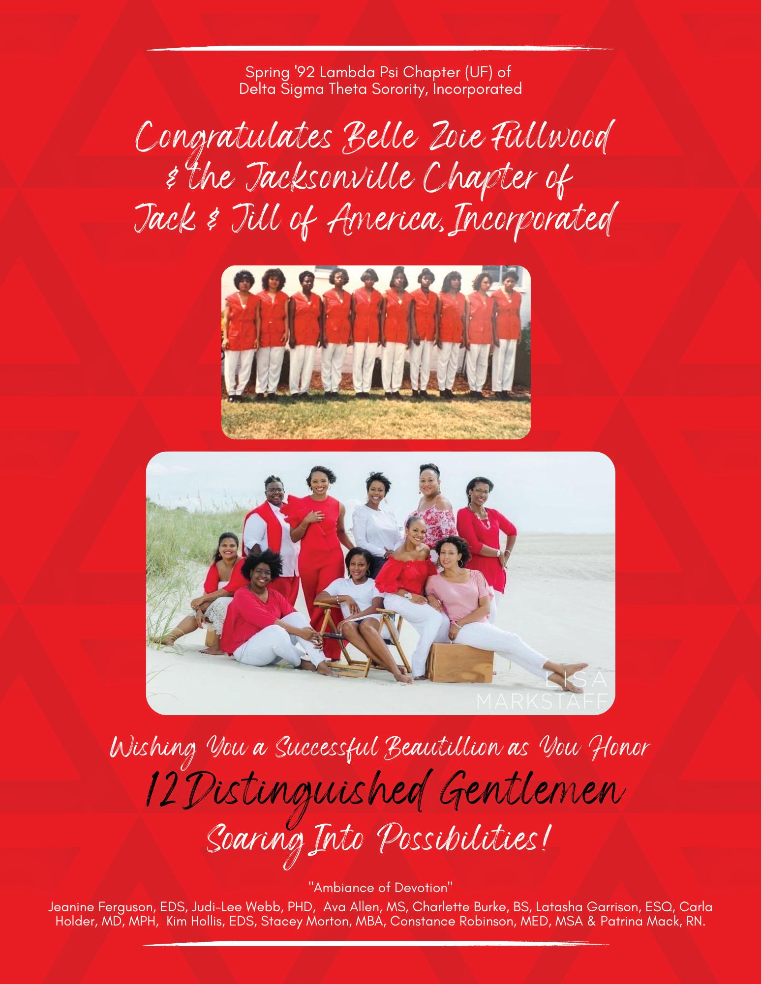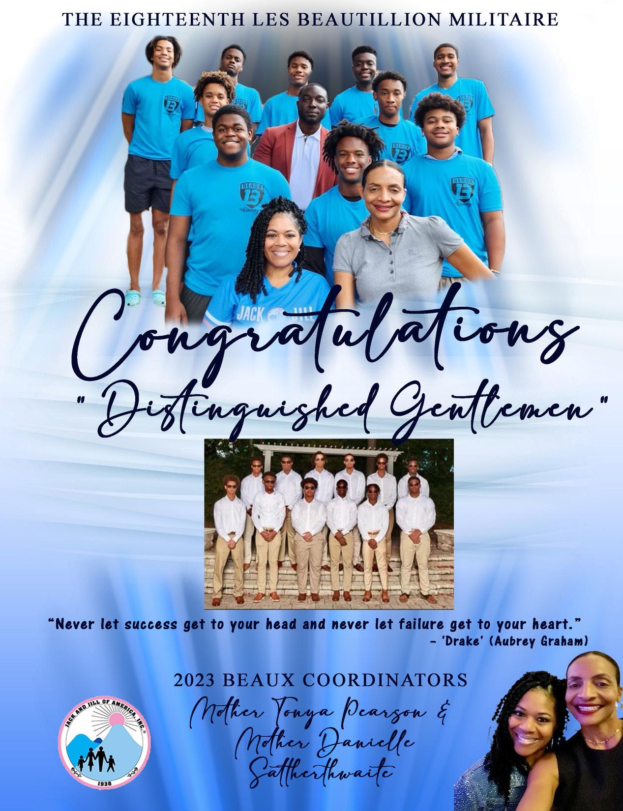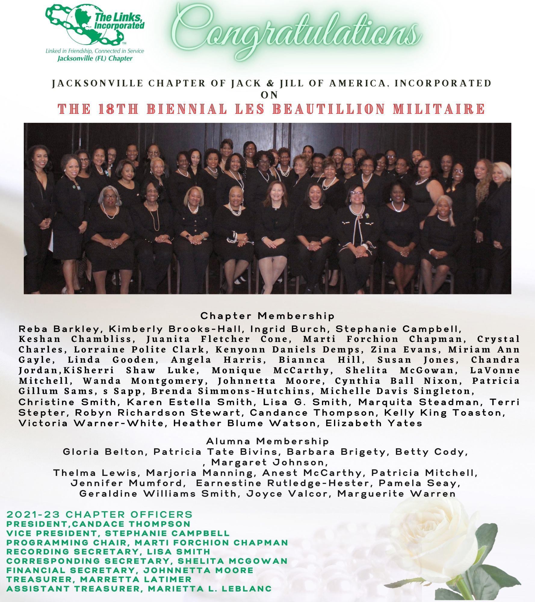On behalf of the Beautillion Steering Committee, it is our distinct onor to welcome you to the 18th Biennial Les Beautillion Militaire presented by the Jacksonville Chapter of Jack and Jill of America, Incorporated. Beautillion is so much more than simply a Scholarship Gala…it is truly a journey; certainly for the young men who articipate as Beaux, but also for those entrusted to craft this experience for them. We have spent the last year studying the excellent productions our chapter has presented in past years, brainstorming exciting ways to add our mark to this innovative program, and planning how to bring our lofty visions to life. Having served as the Beaux Coordinators for the 2021 Beautillion Class we observed firsthand the incredible dedication required of the previous Chairs and Co-Chairs and we were excited to accept this awesome challenge.