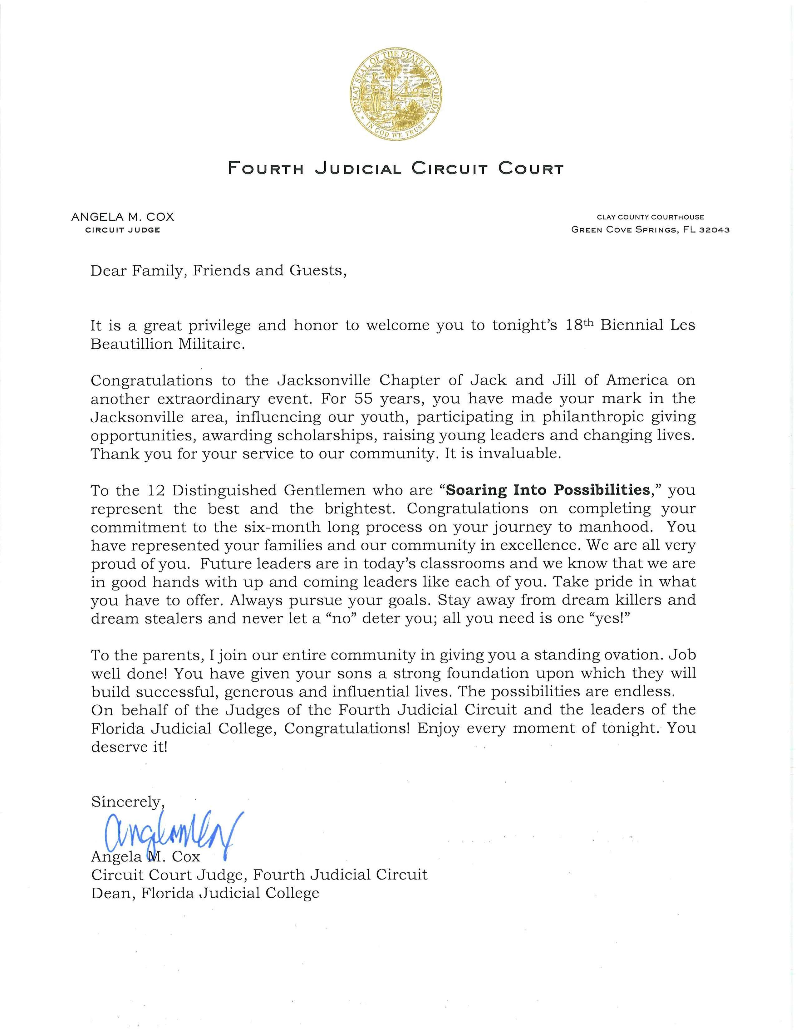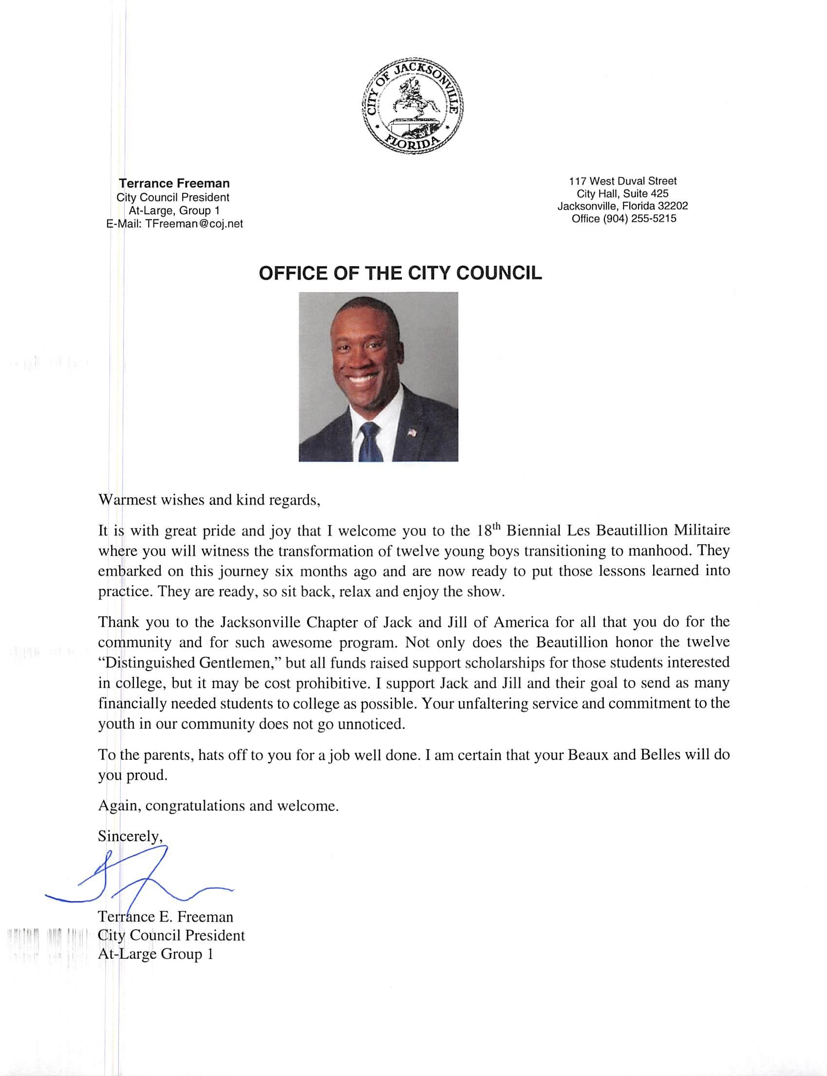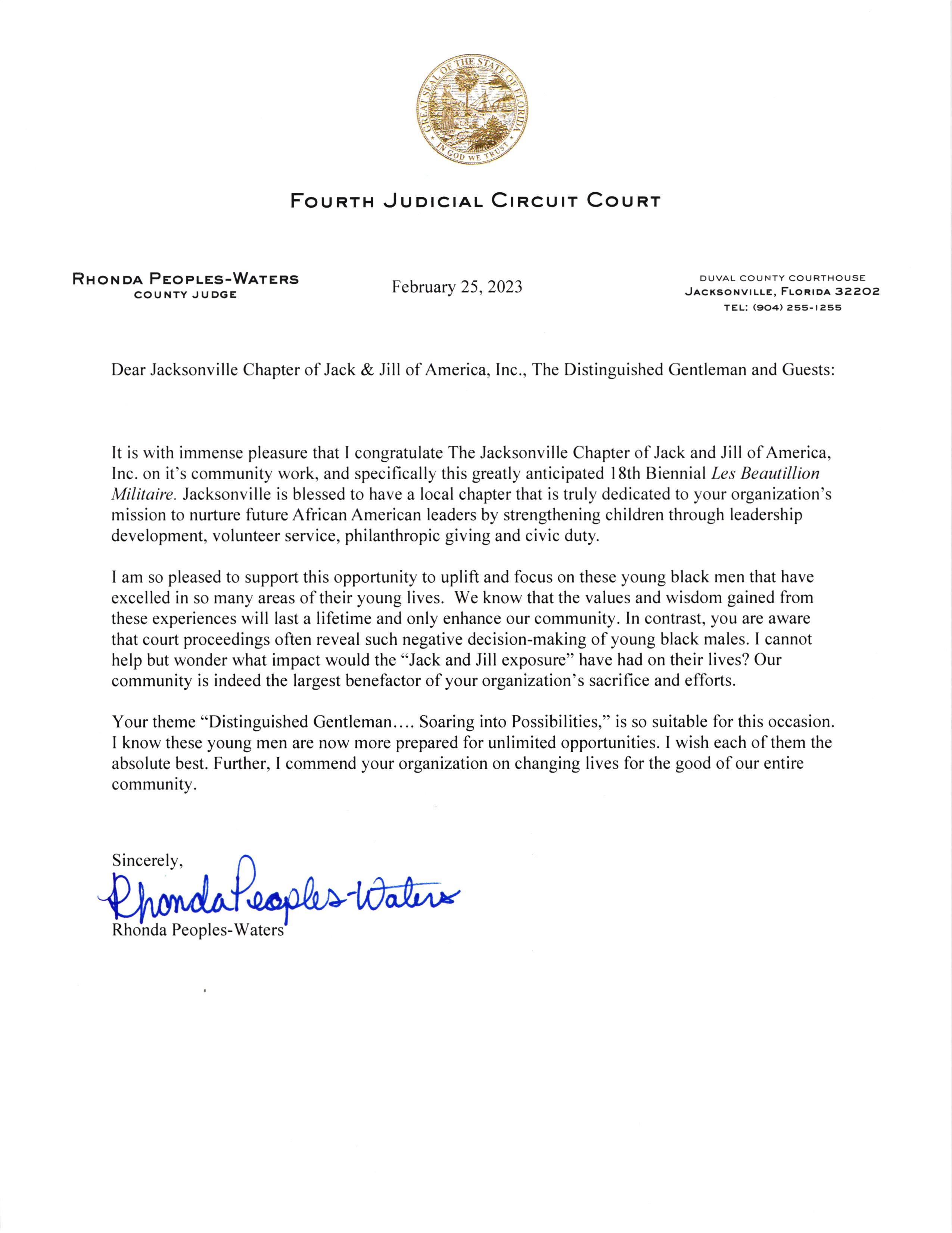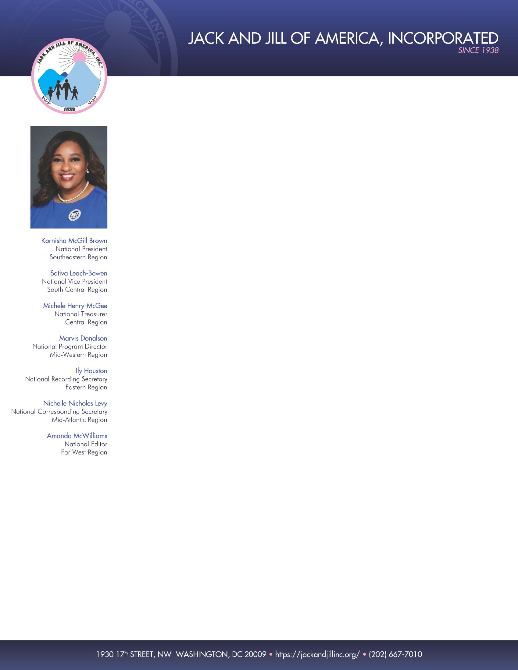 On behalf of the Beautillion Steering Committee, it is our distinct onor to welcome you to the 18th Biennial Les Beautillion Militaire presented by the Jacksonville Chapter of Jack and Jill of America, Incorporated. Beautillion is so much more than simply a Scholarship Gala…it is truly a journey; certainly for the young men who articipate as Beaux, but also for those entrusted to craft this experience for them. We have spent the last year studying the excellent productions our chapter has presented in past years, brainstorming exciting ways to add our mark to this innovative program, and planning how to bring our lofty visions to life. Having served as the Beaux Coordinators for the 2021 Beautillion Class we observed firsthand the incredible dedication required of the previous Chairs and Co-Chairs and we were excited to accept this awesome challenge.